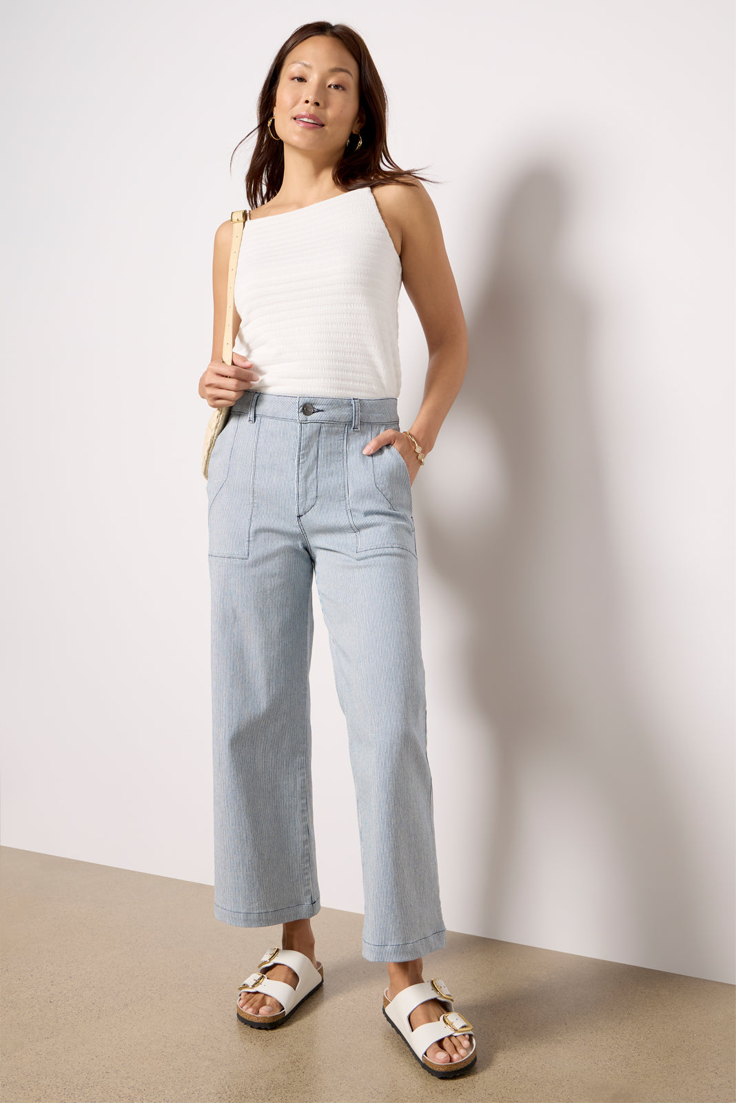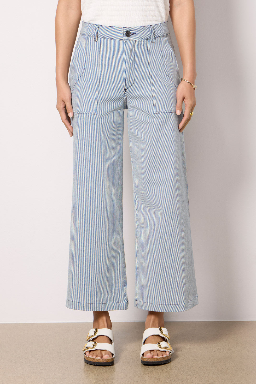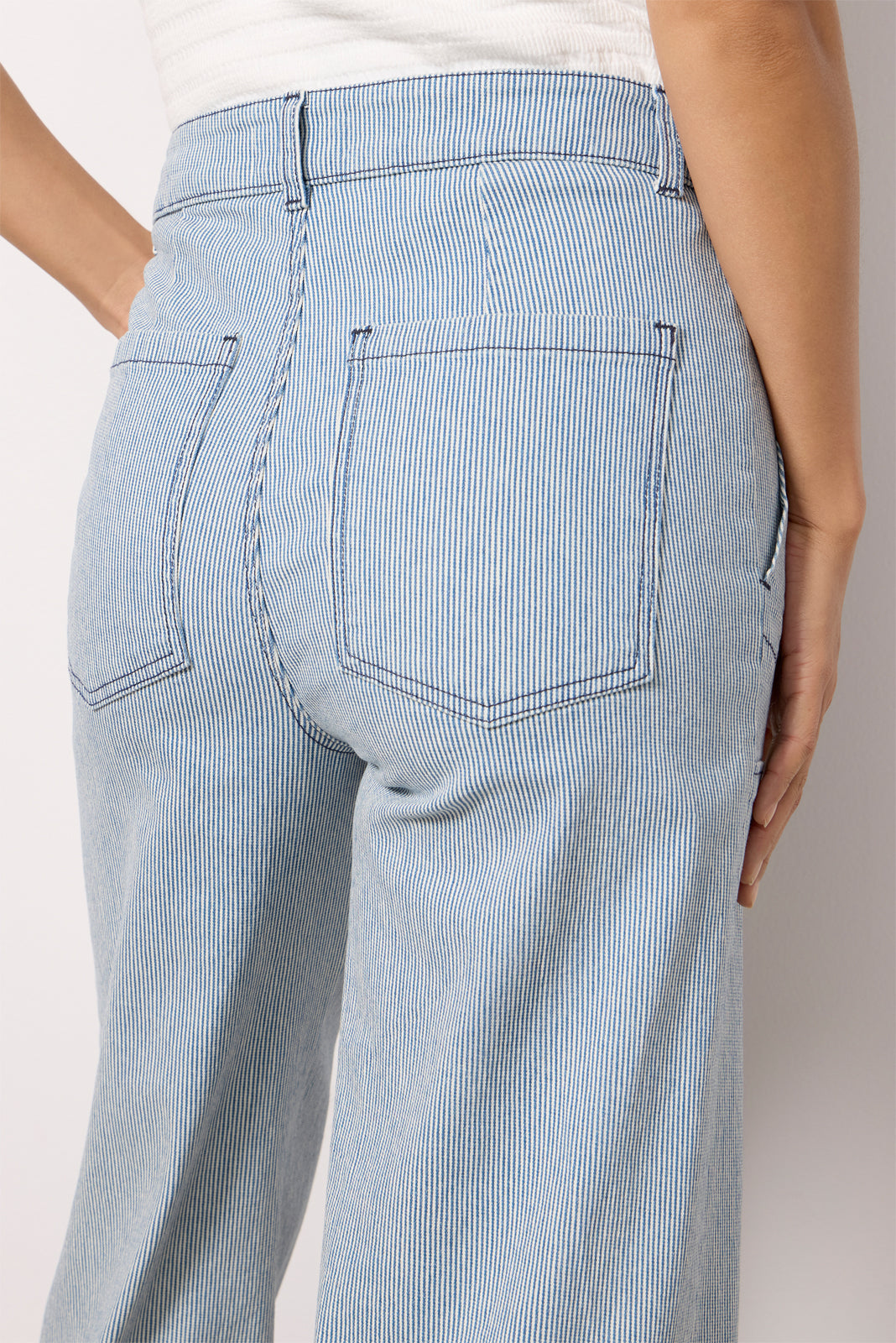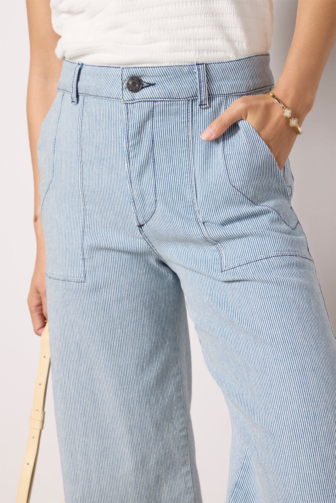 Railroad striped denim updates the most-loved Meg jean by KUT From The Kloth. Perfect for your spring wardrobe. this wide leg silhouette is crafted in a stretch cotton blend with ankle-length hems and patch pockets.