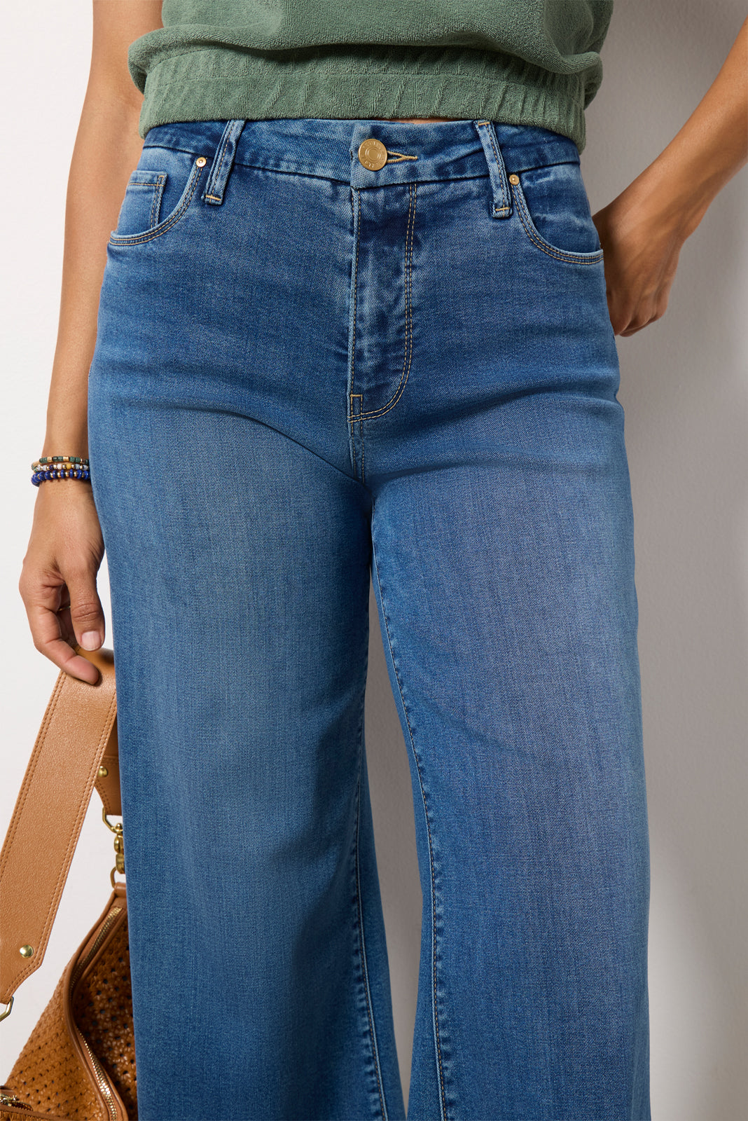 Round out your denim collection with the must-have Meg?wide leg jean by?KUT From The Kloth. featuring a medium blue wash and ankle-length raw hems.