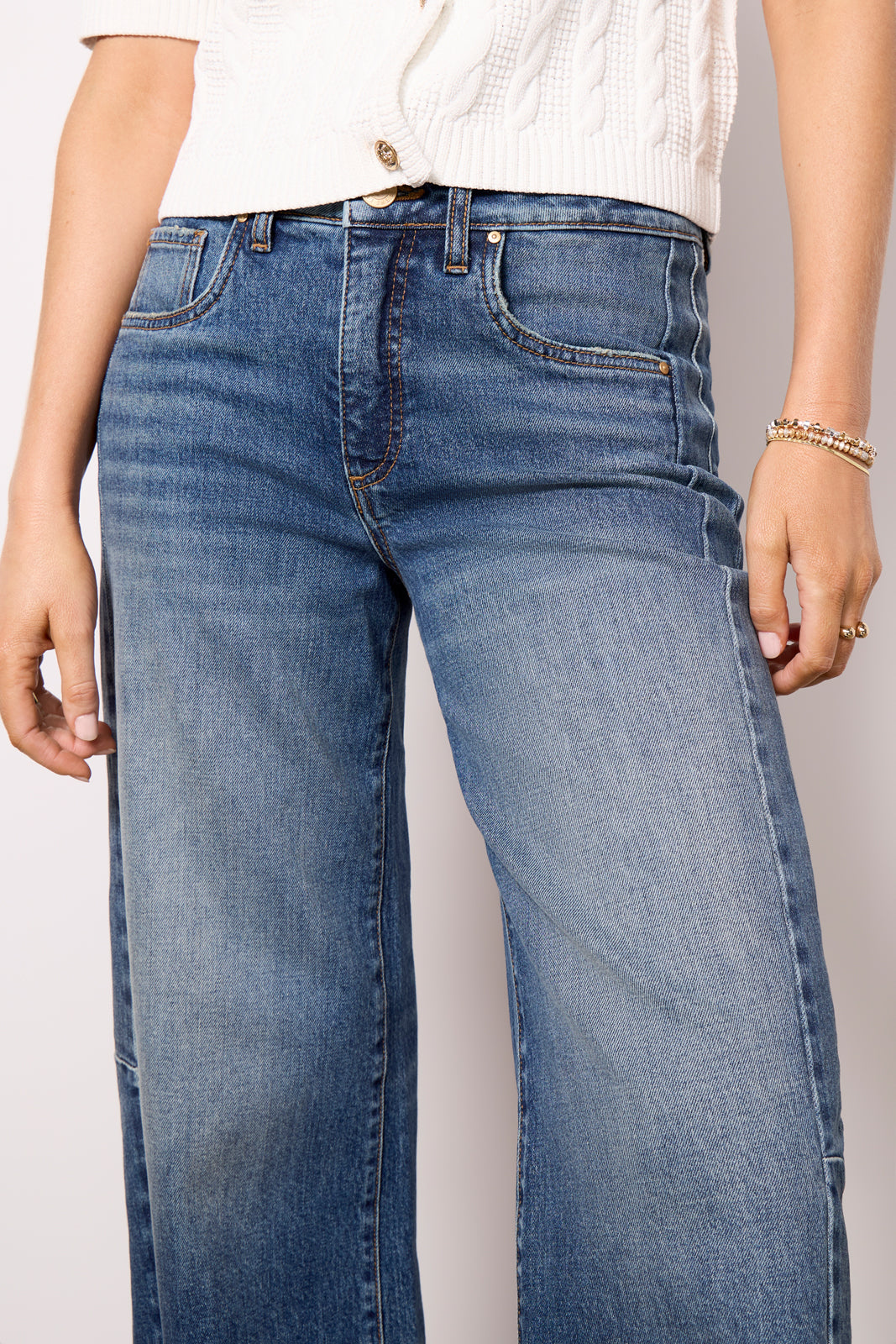 Side seam detailing updates?the most-loved Meg jean by?KUT From The Kloth. Perfect for any day-to-night look. these wide leg jeans are crafted in comfort-stretch denim with ankle-length raw hems and a faded blue wash.