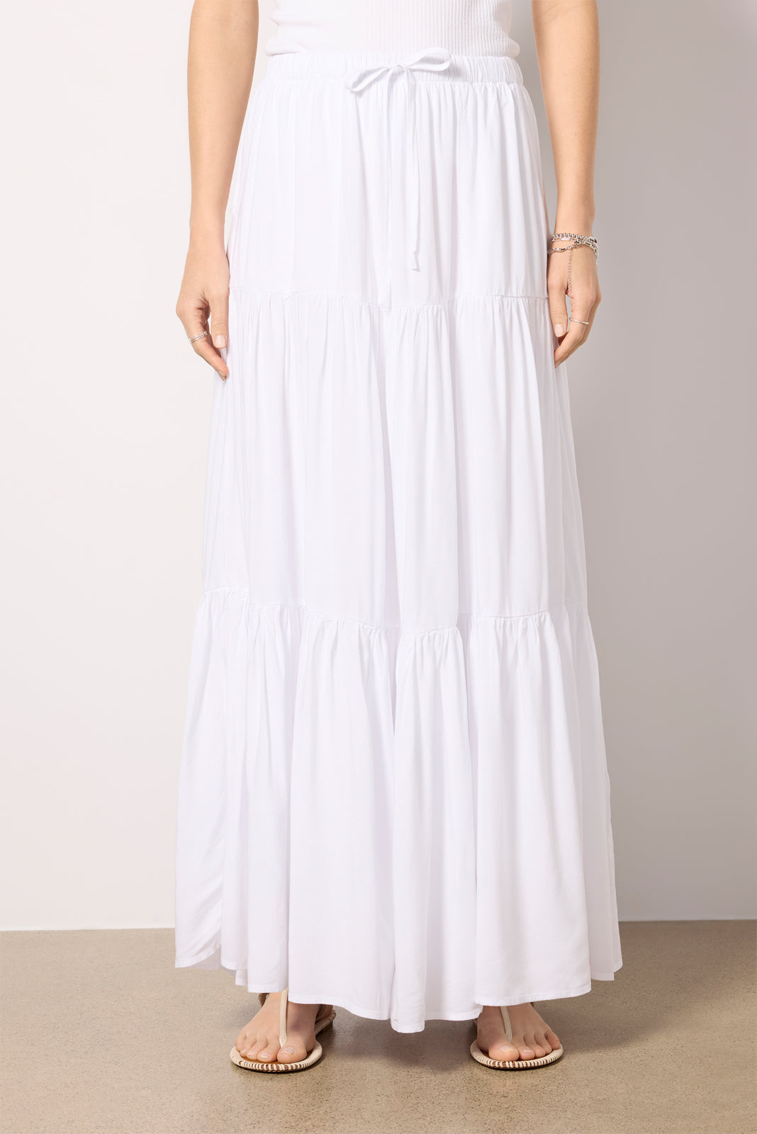 Say hello to your new favorite summer staple. the Melanie Skirt by Splendid features a drawstring waist. tiered detailing. and a maxi silhouette.?