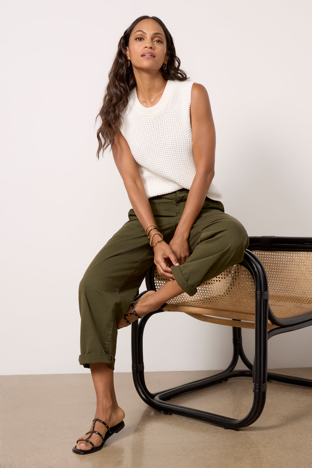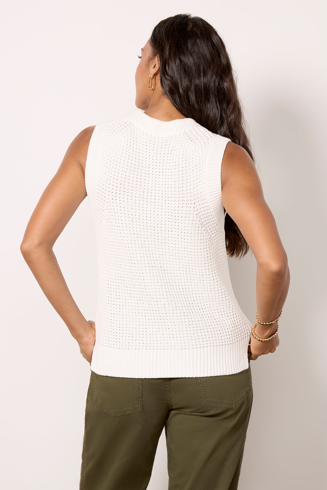 A textured waffle knit elevates this stylish sweater tank by French Connection. featuring a sleeveless silhouette and wide ribbed trim.?Style for the season with cargo pants or wide leg jeans.