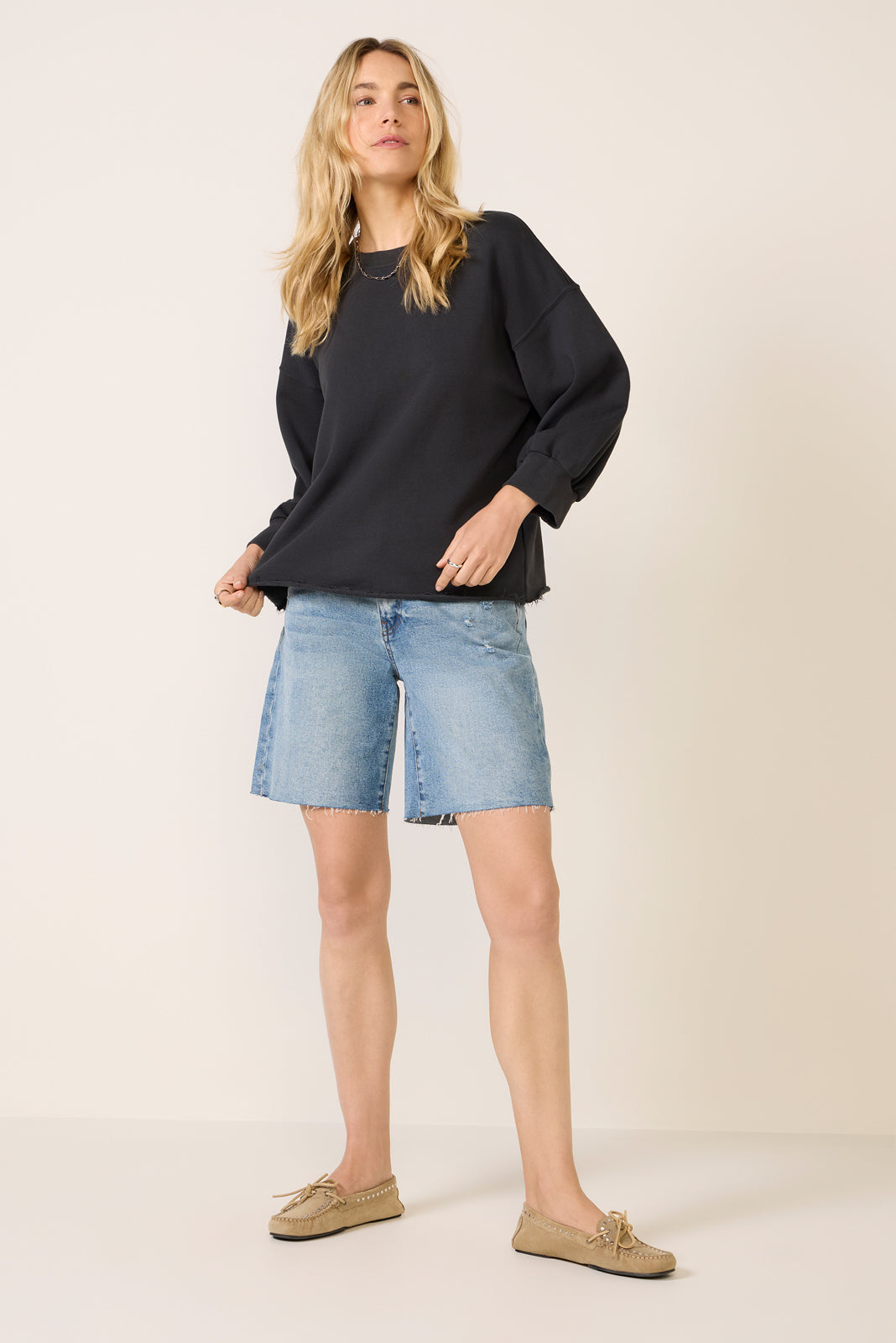 Designed with comfort in mind. the Niall Fleece Pullover by Perfectwhitetee features a crew neckline. a relaxed fit. and a cropped raw hem.