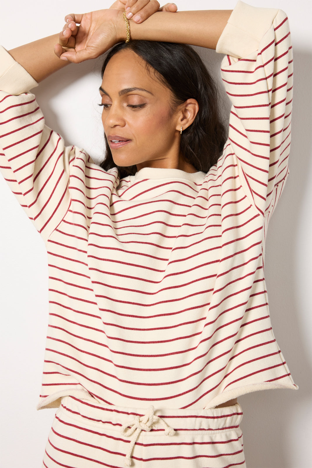 Finished in comfy French terry fabric. the Niall striped sweatshirt by perfectwhitetee features a crewneck silhouette. raw edge hem. and three-quarter sleeves with ribbed cuffs. Make it a matching set with the coordinating Bennie Striped Short.