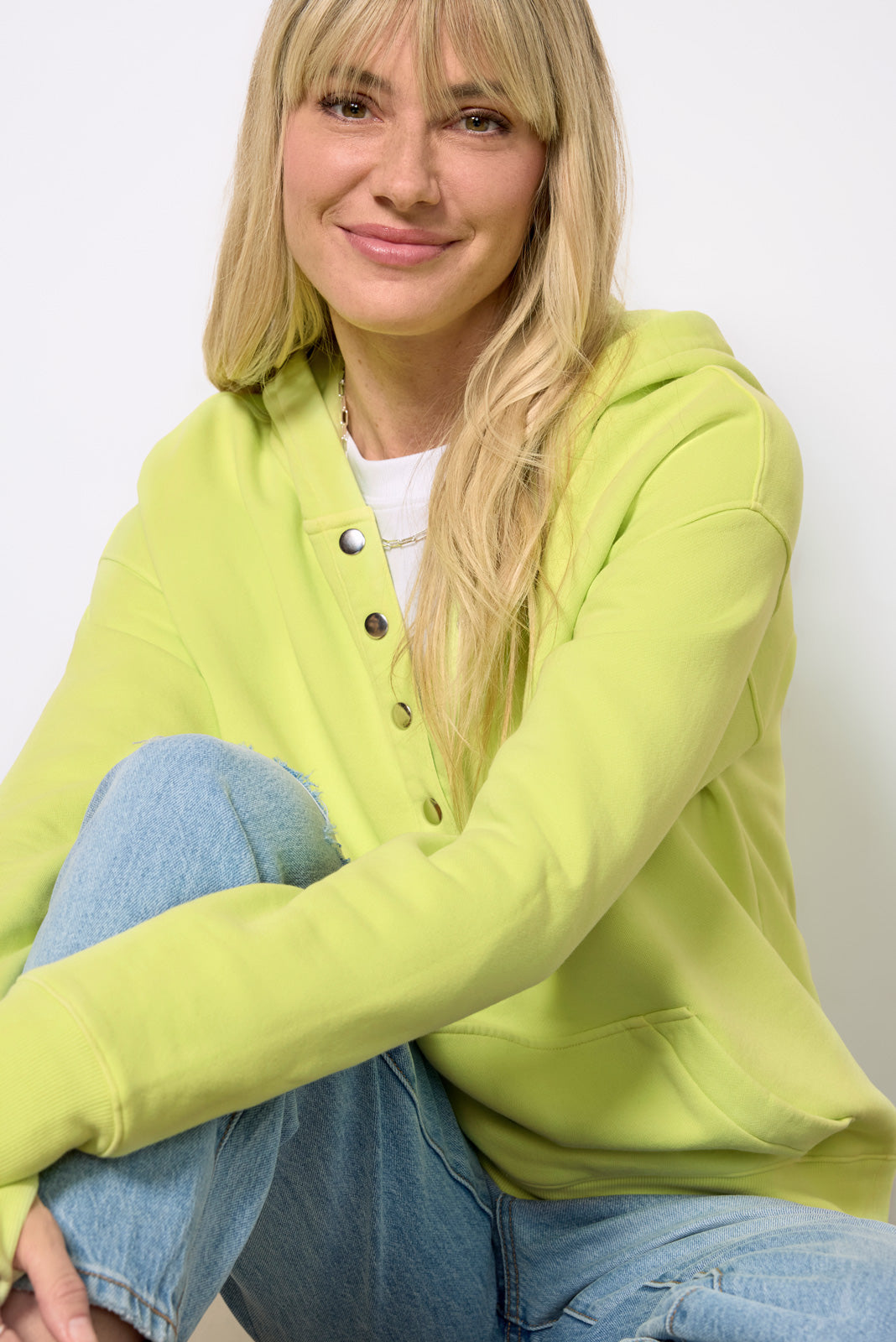 A pop of citron is the perfect way to brighten your cold-weather wardrobe. The Nola Hoodie by EVEREVE features front snap closures. a front kangaroo pocket. and a relaxed silhouette.