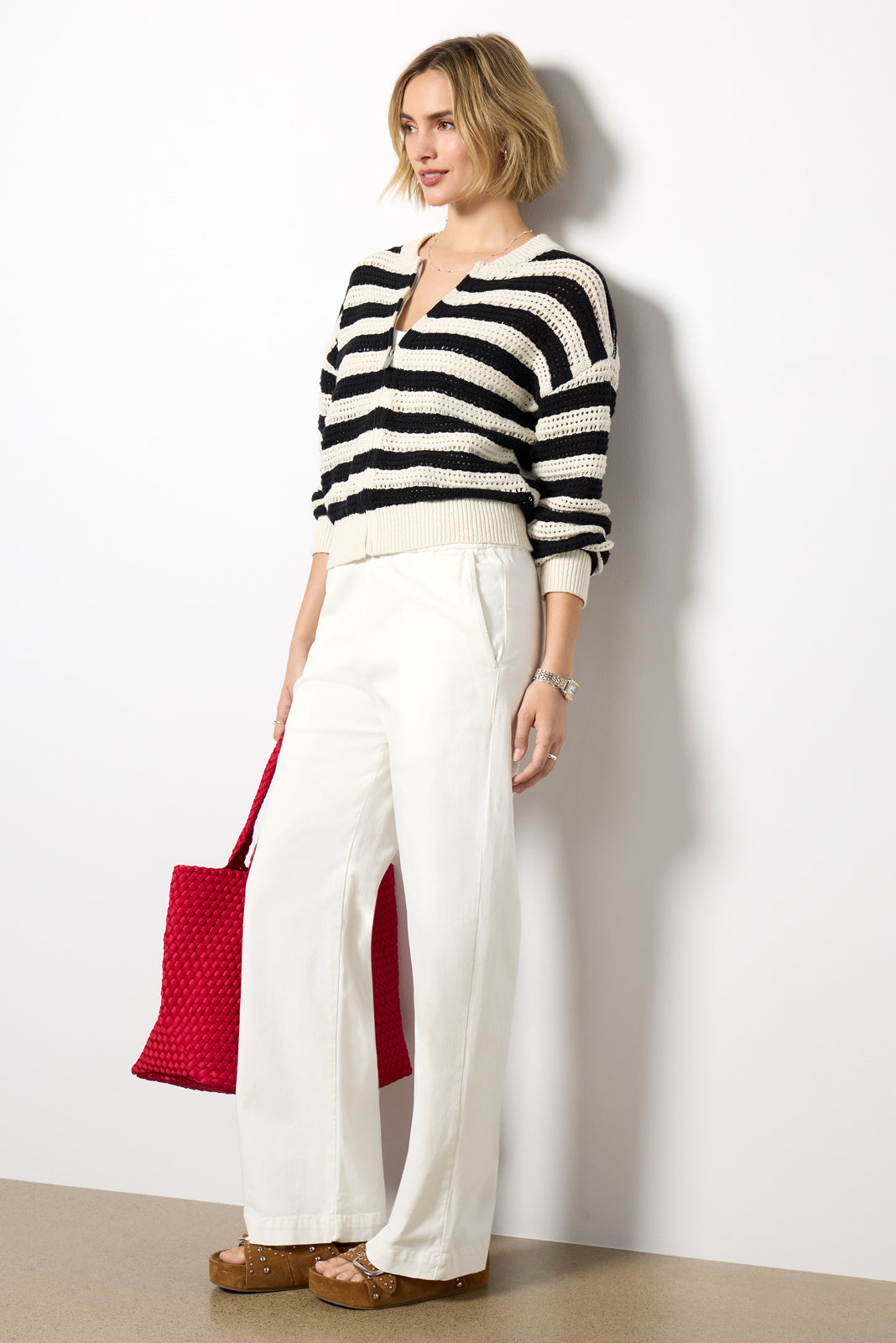 Layer any warm-weather look with this?open-knit bomber jacket by Sanctuary. Finished in?chic stripes. this zip-up silhouette features a round collar. ribbed trim. and dropped shoulders.