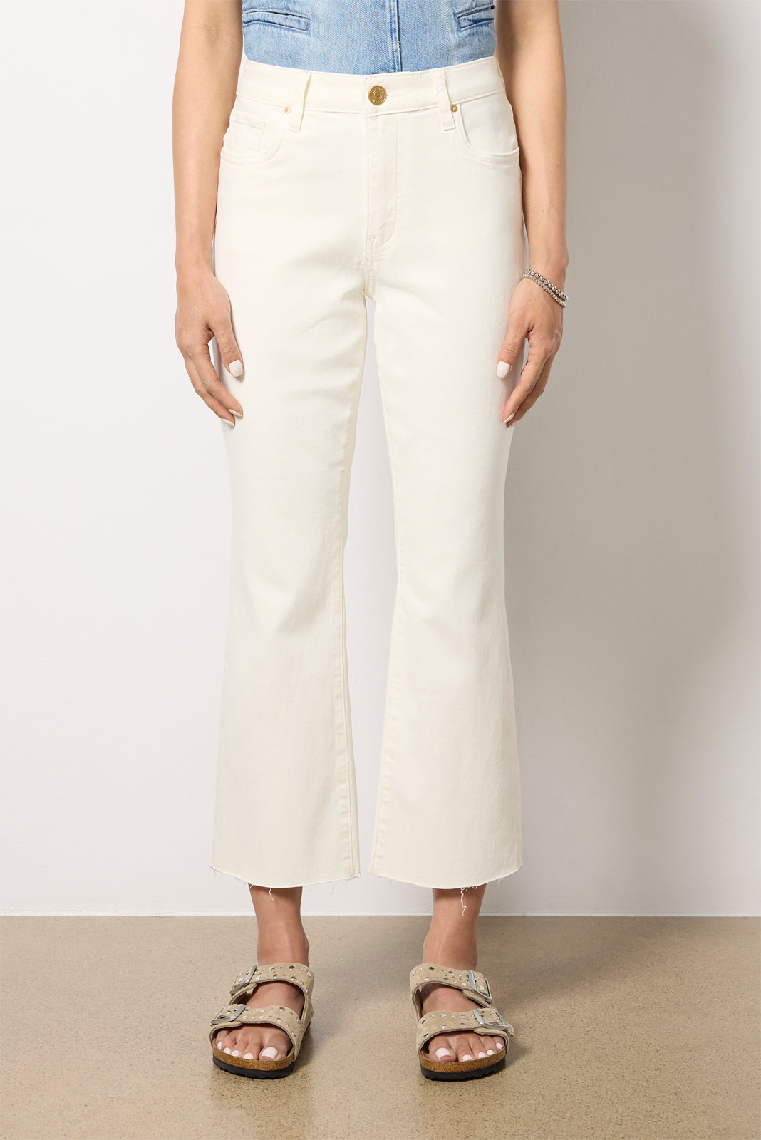 A gently flared leg creates the easy-to-love silhouette of these KUT From The Kloth jeans. Designed with a shorter inseam for a petite-friendly fit. the Kelsey jean is crafted in soft stretch denim and features an ecru wash and ankle-length raw hems.