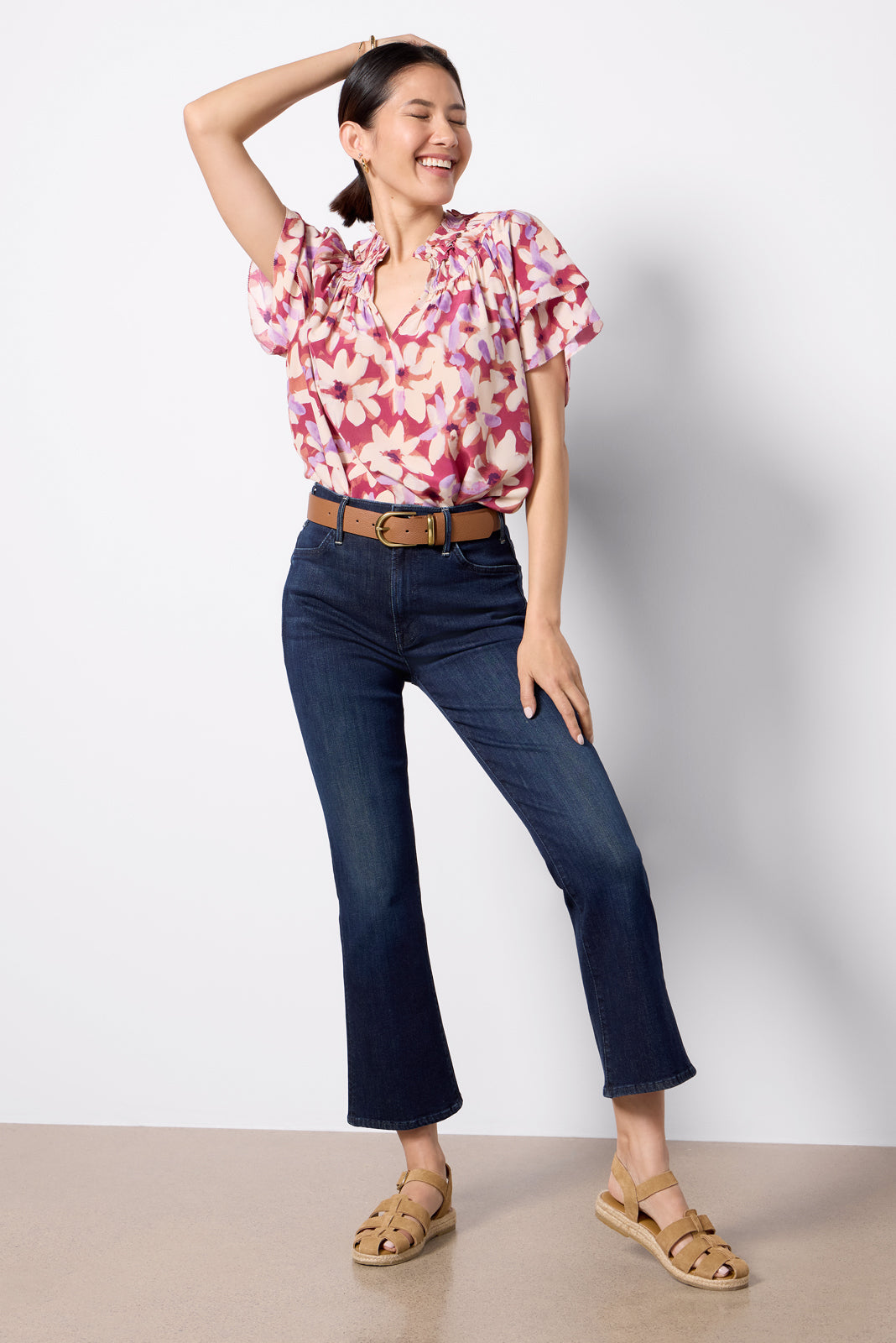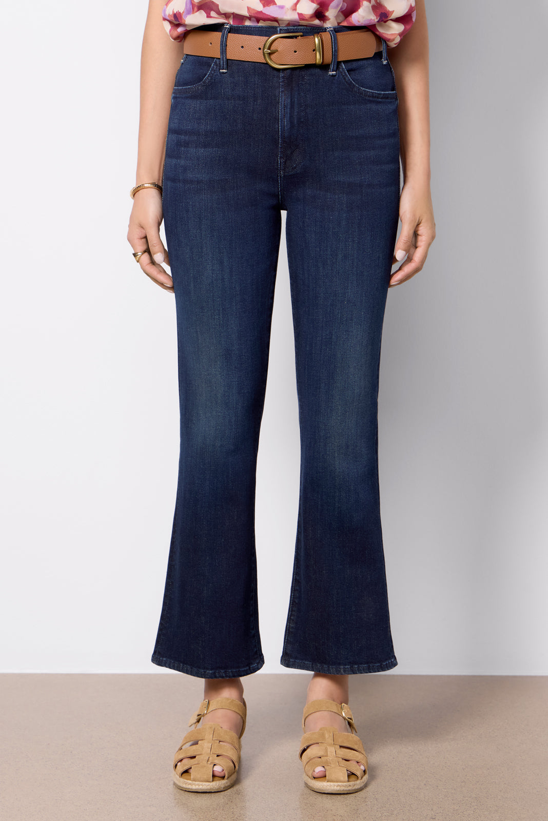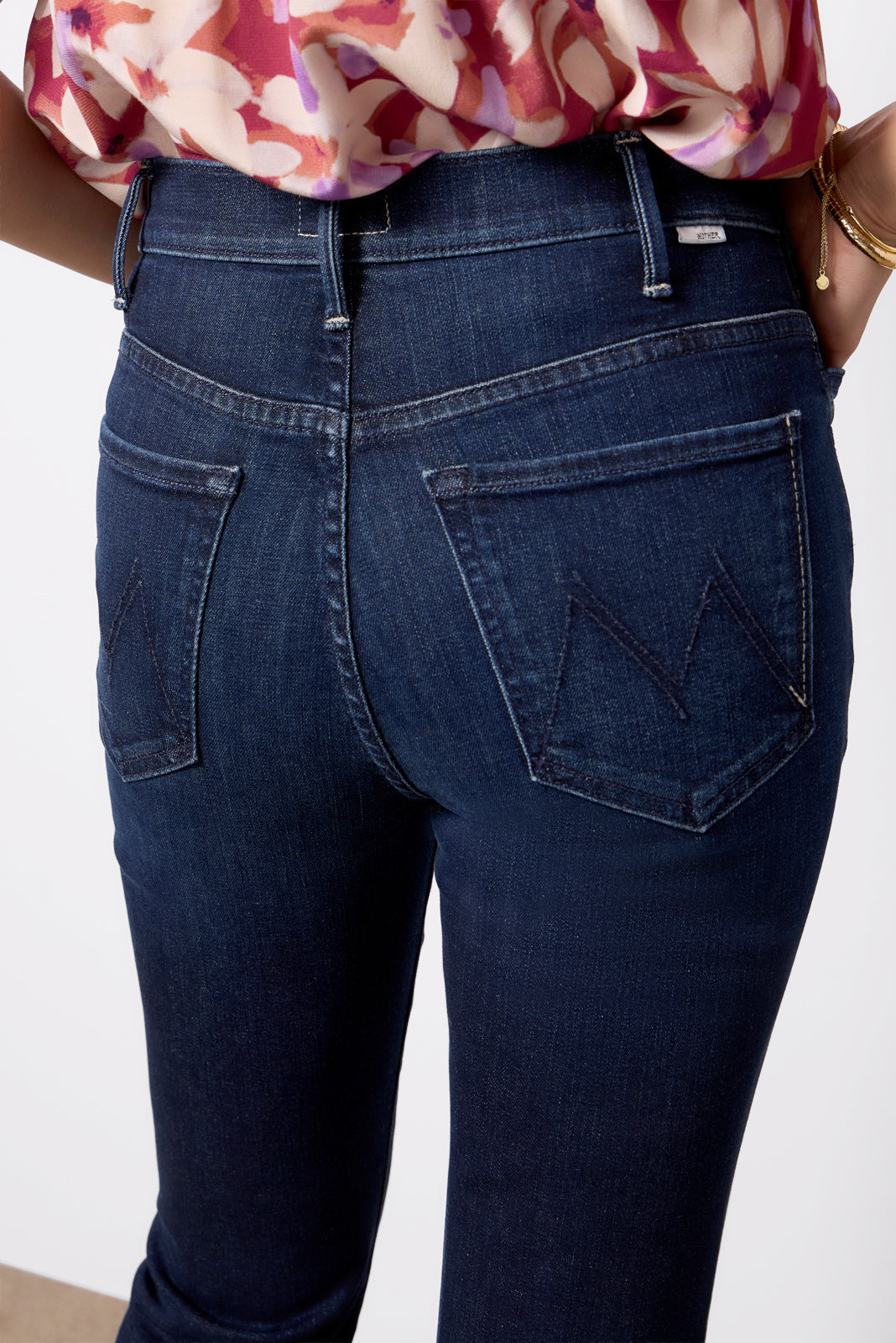 The Lil Hustler Ankle jean by MOTHER is a petite flare silhouette. featuring an ankle-length inseam. clean hems. and soft stretch denim in a dark blue wash. Designed to complement petite body types. these jeans feature a higher knee placement. shorter inseam. and shorter rise for a perfect. always-flattering fit.