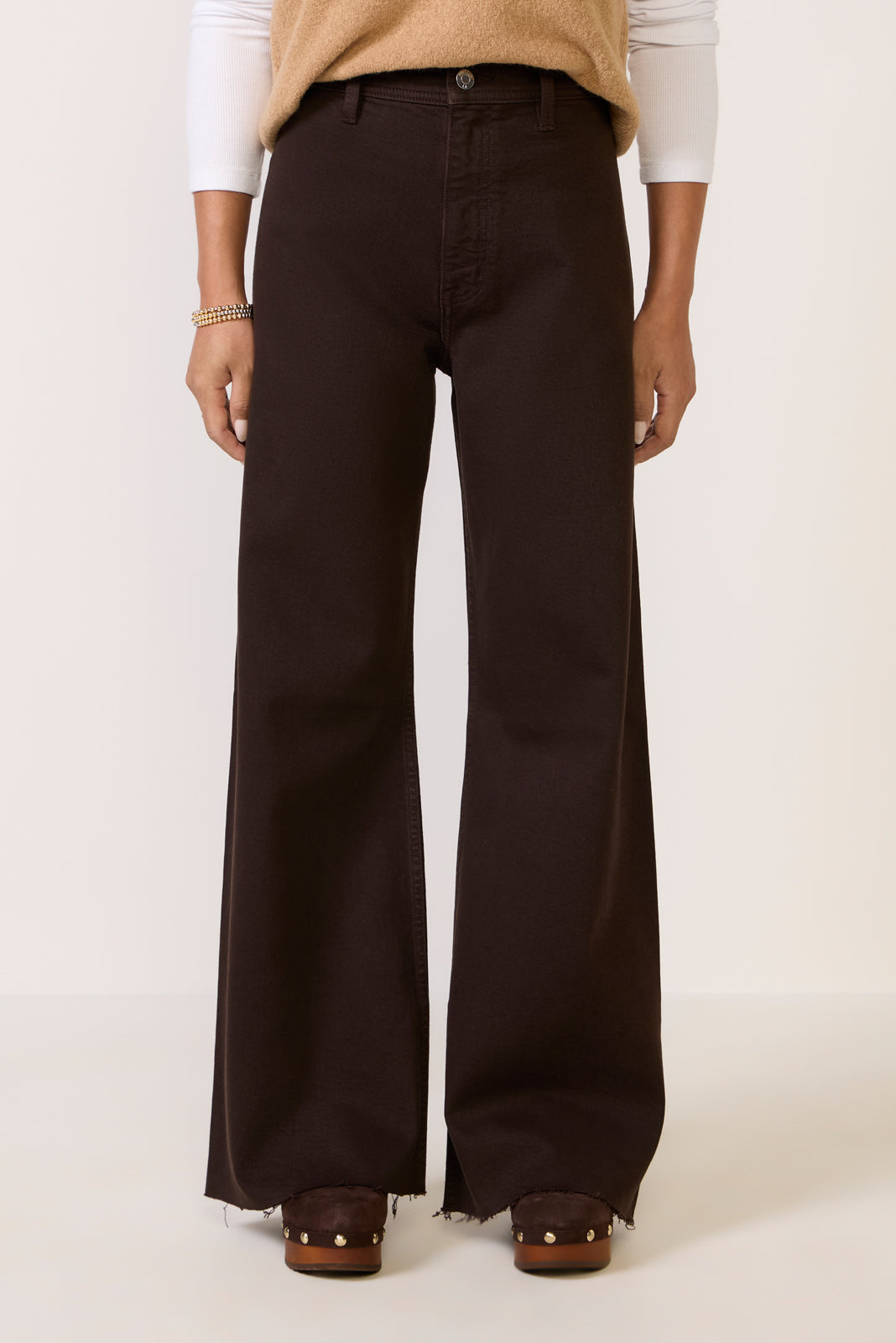 Finished in a rich brown wash with a shorter inseam and rise for petite frames. the Petite Penny wide leg jean by Pistola features a high-rise fit. raw hems. and soft stretch denim fabric.