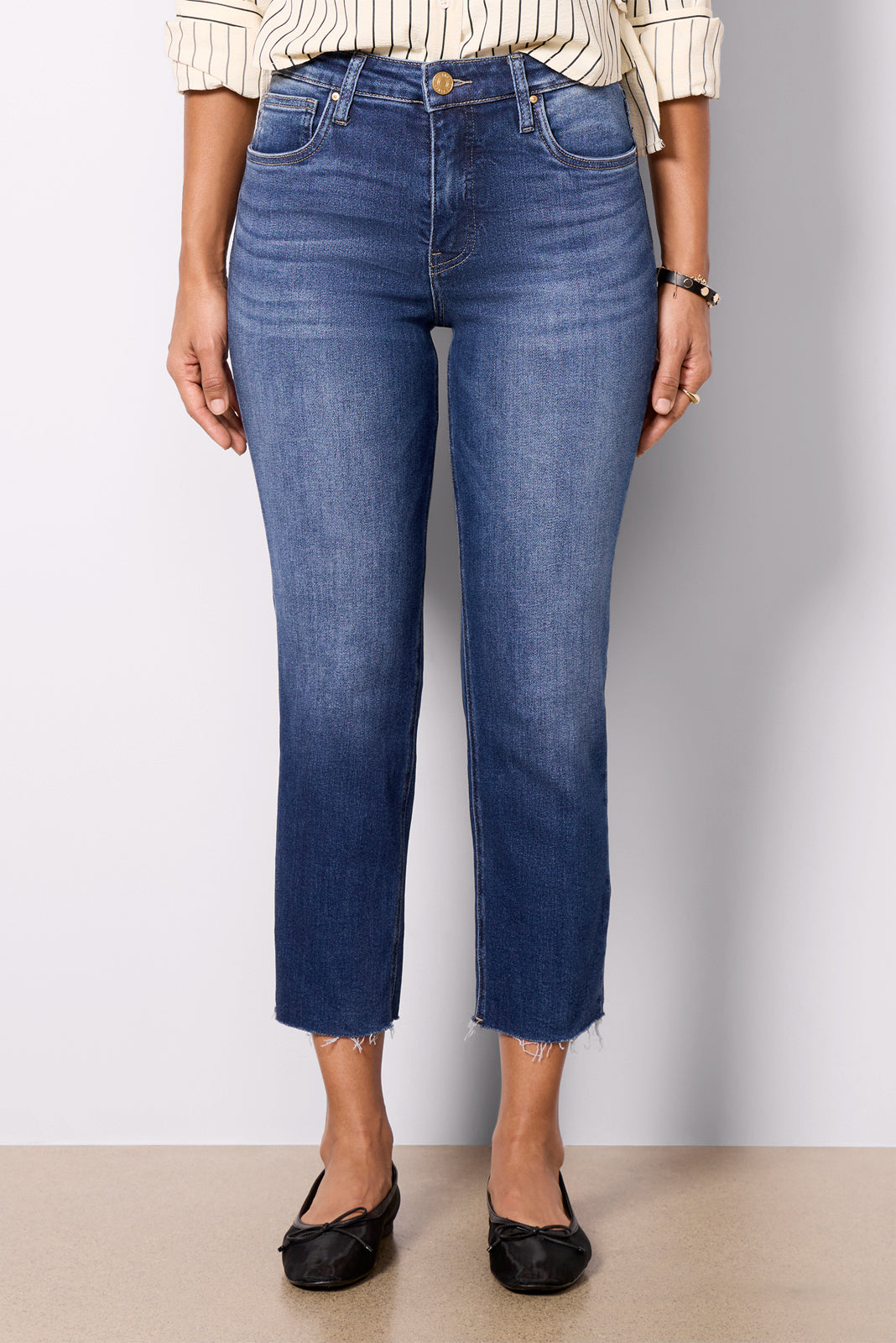Top off your denim collection with the Rachael jean by KUT From The Kloth. Crafted in comfort-stretch denim. these versatile jeans feature a slim straight leg. faded blue wash. and ankle-length raw hems.