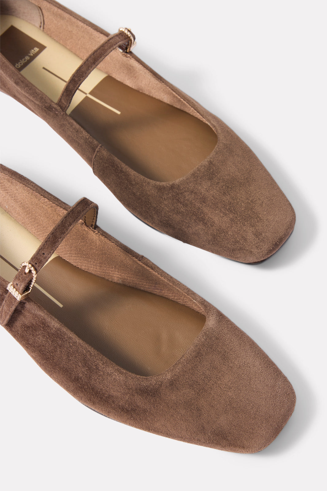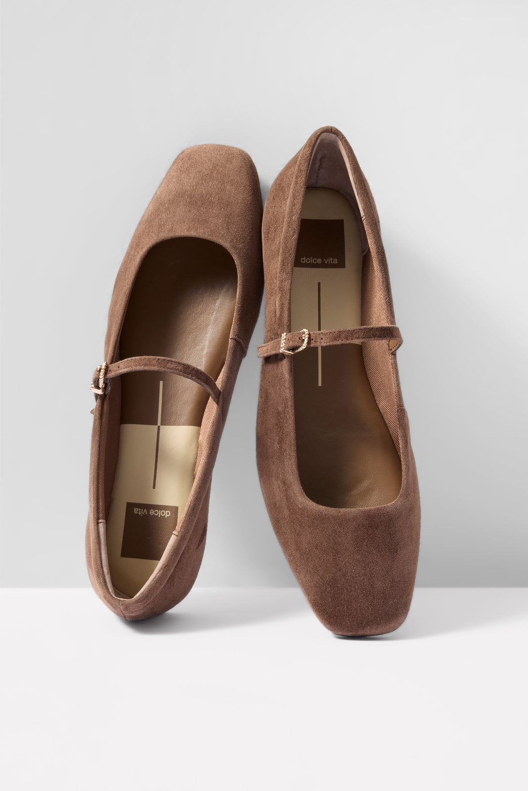 A chic take on your classic ballet flat. the Reyes Mary Jane by Dolce Vita is finished in chocolate brown suede with a square toe and adjustable strap.