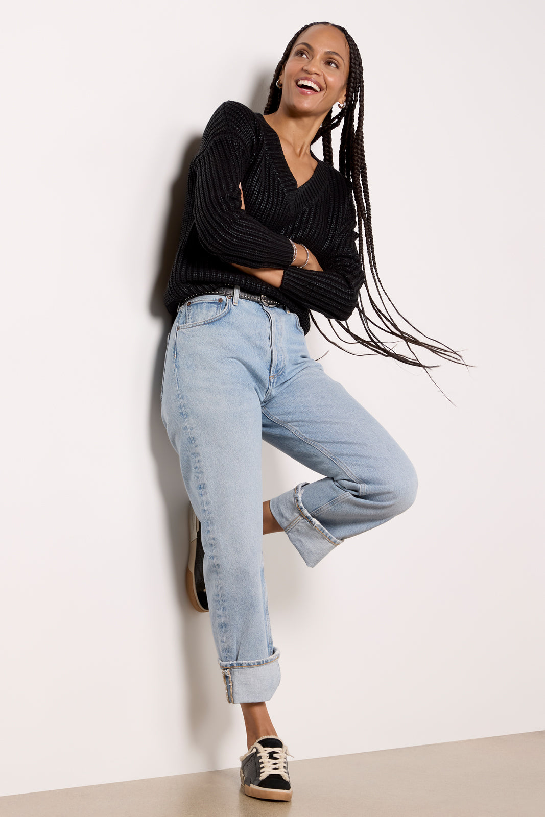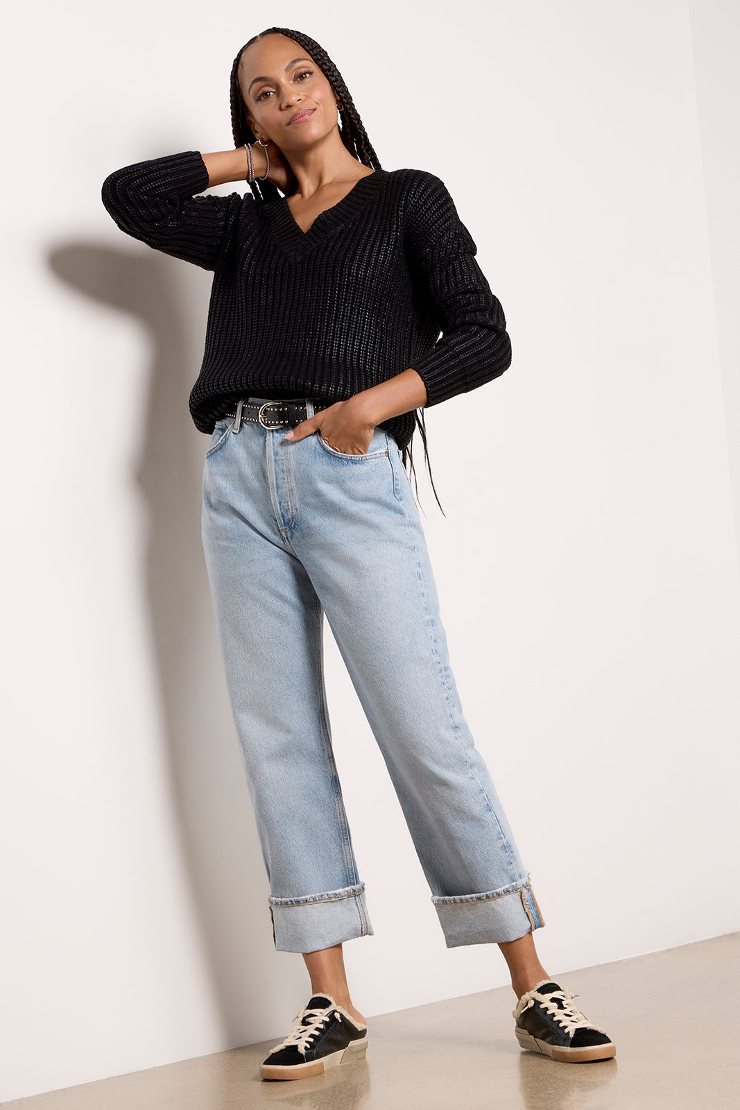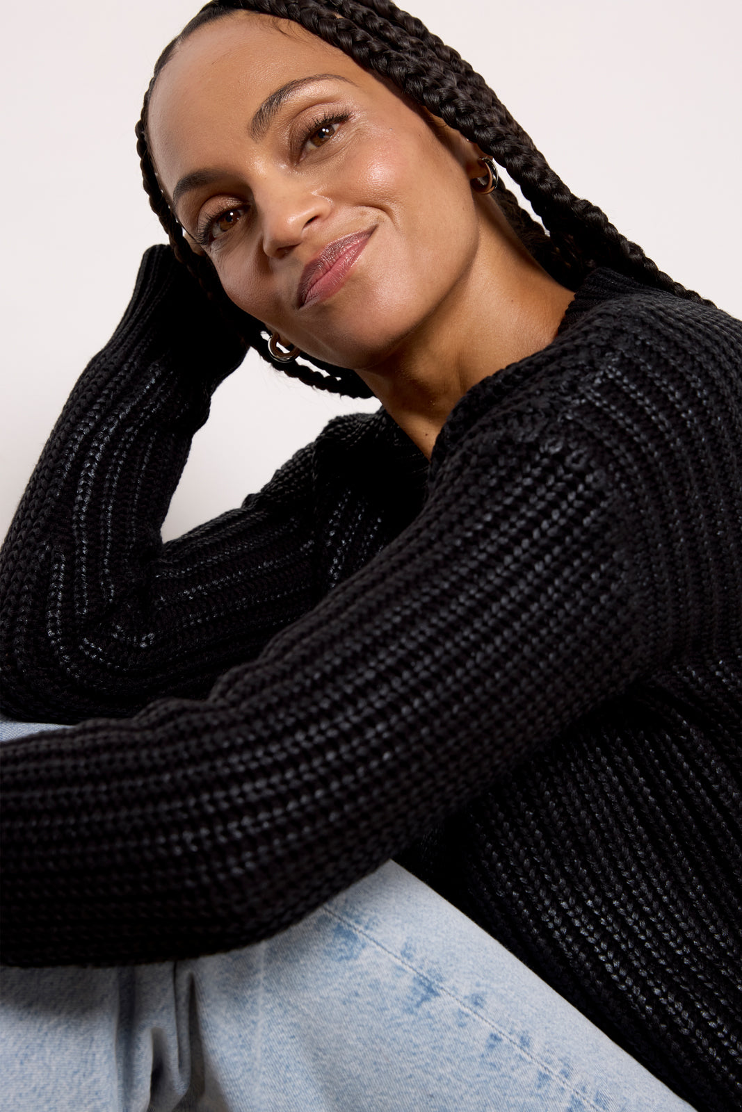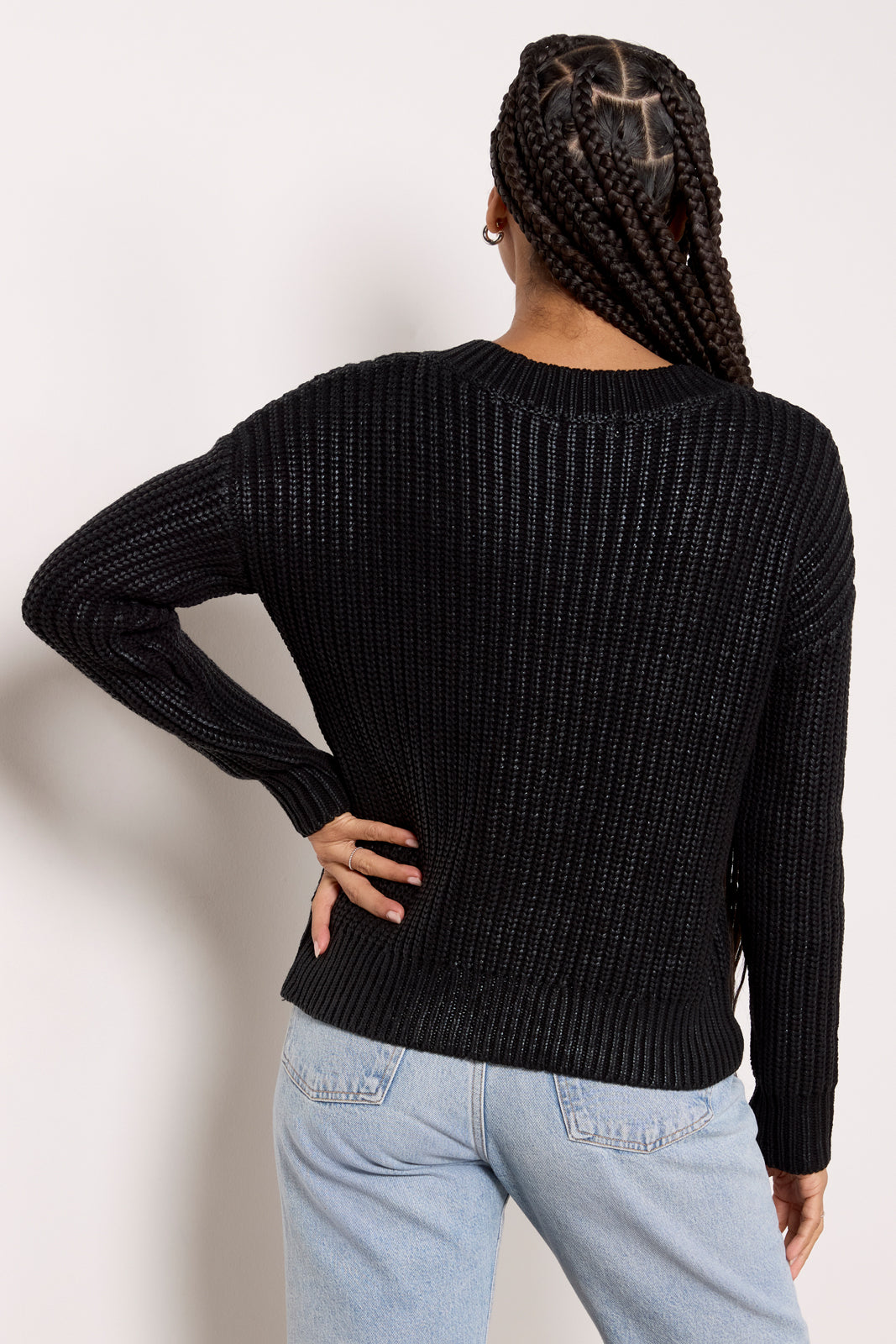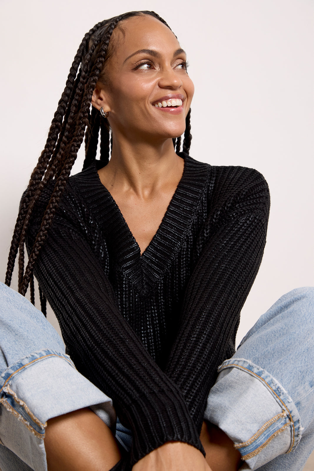 The River Pullover will add a stylish edge to your sweater collection. finished in a coated knit with a v-neckline. dropped shoulders. and ribbed trim. Style for the season with jeans or a faux leather skirt.