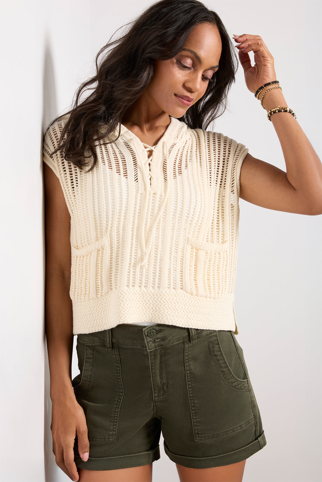 Top off your summer knit collection with the Robin crochet hoodie by EVEREVE. This breezy open-weave sweater features a sleeveless. hooded silhouette with a lace-up neckline. cropped fit. and front patch pockets.