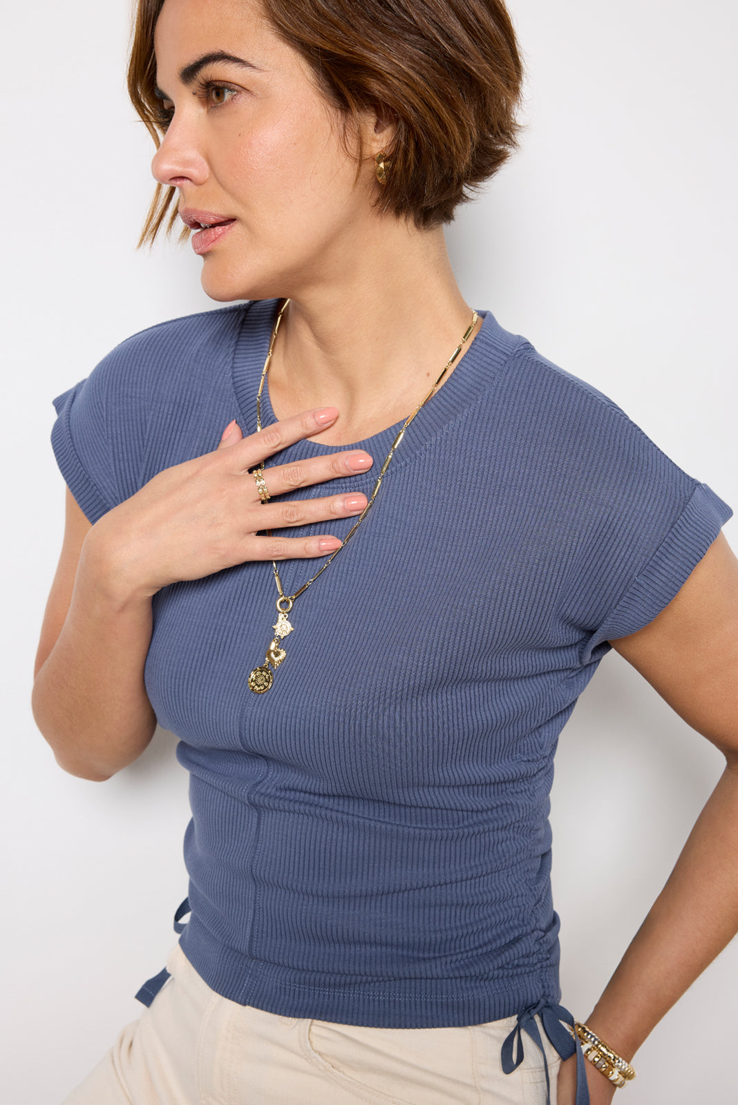 Designed to flatter. the Sawyer Side Tie Top by EVEREVE features a crew neckline. rolled short sleeves. side ruching. and a fitted silhouette.?