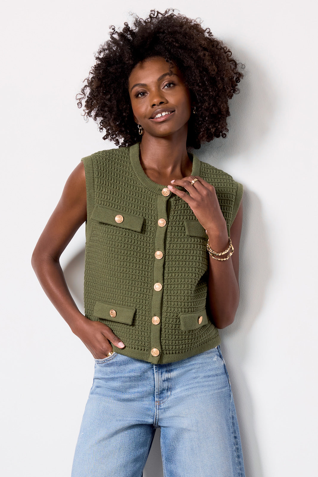 Chic and polished. the Smooth Sailing LadyLike sweater vest by BlankNYC is crafted in a textured cotton-blend knit and features a cropped silhouette with a round neckline. ribbed trim. and gold button closures.