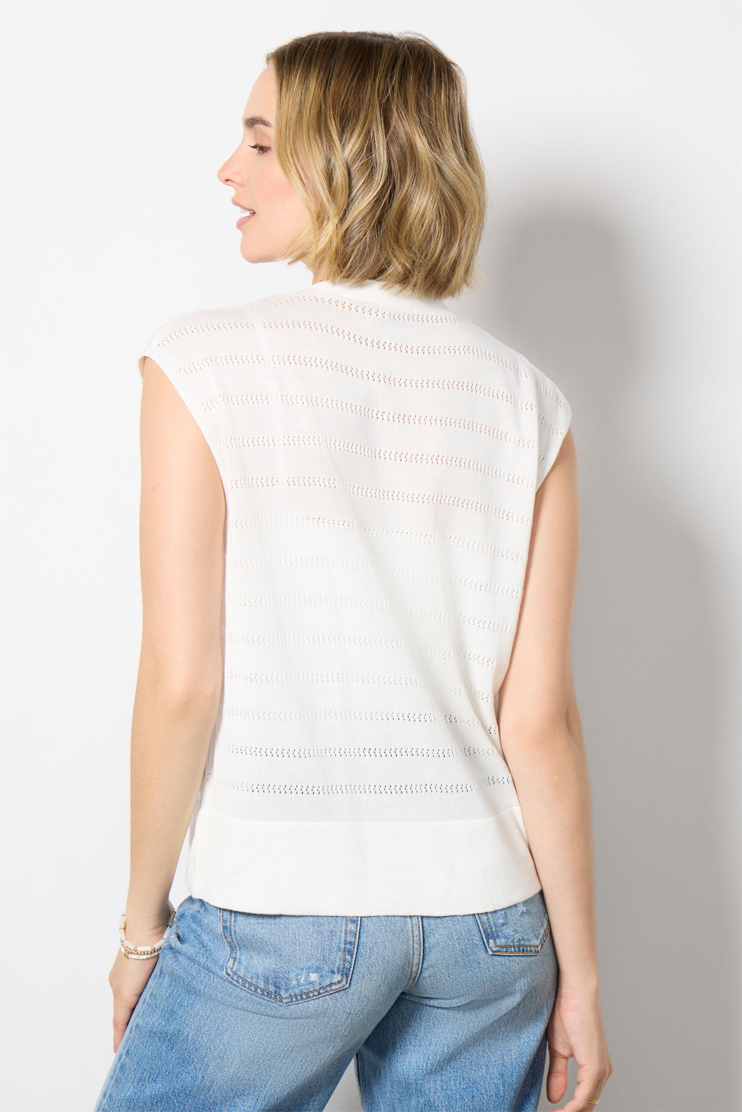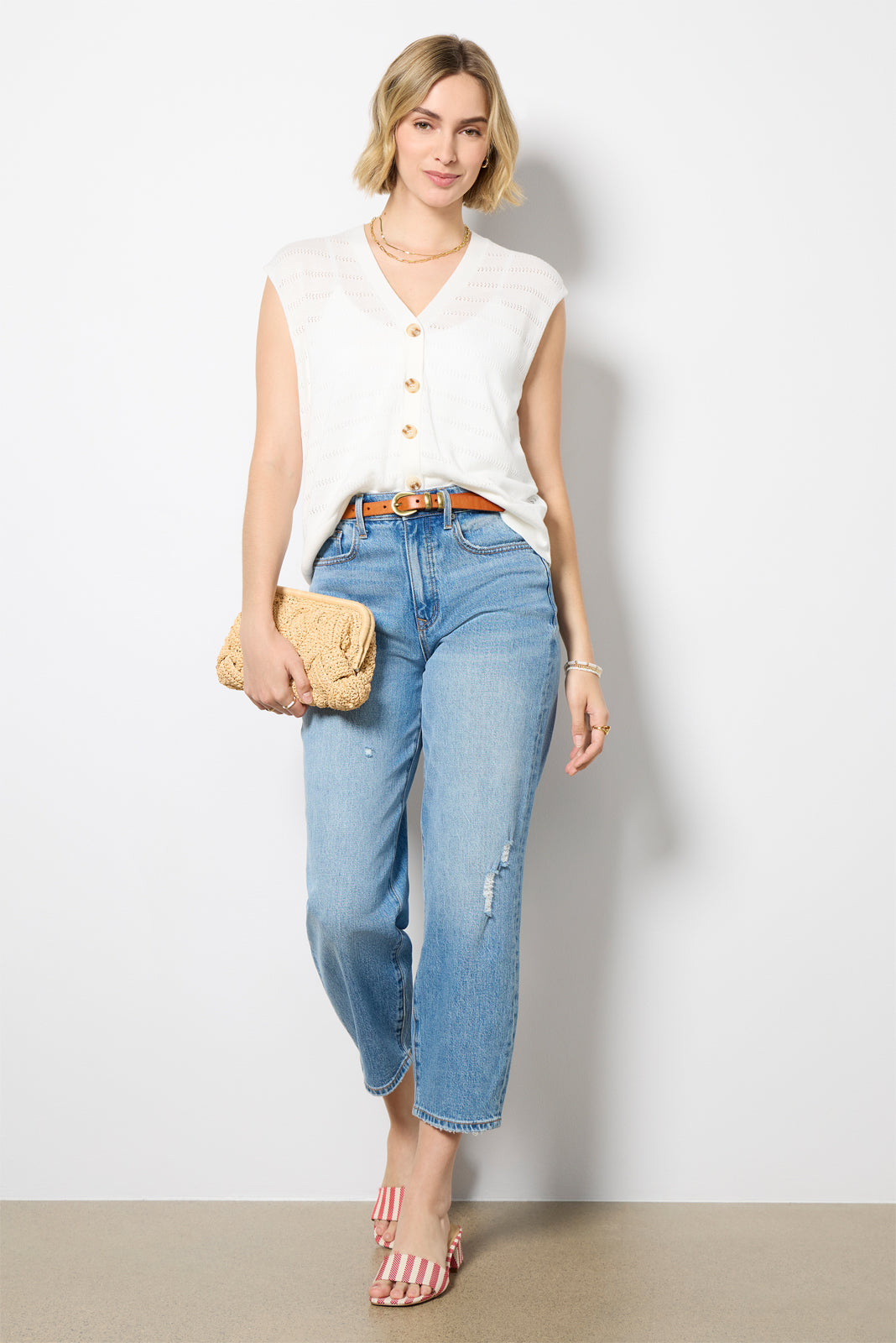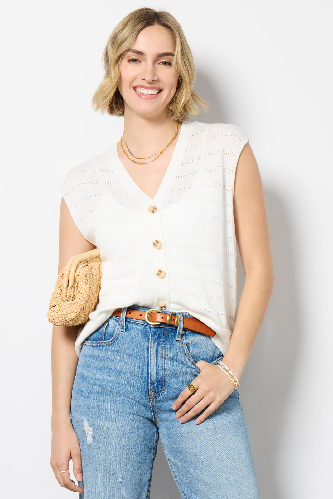Chic and summer-ready. the St. Kitts sweater tank by EVEREVE?features a relaxed v-neck silhouette. finished in a semi-sheer knit?with pointelle stripes and front button closures.