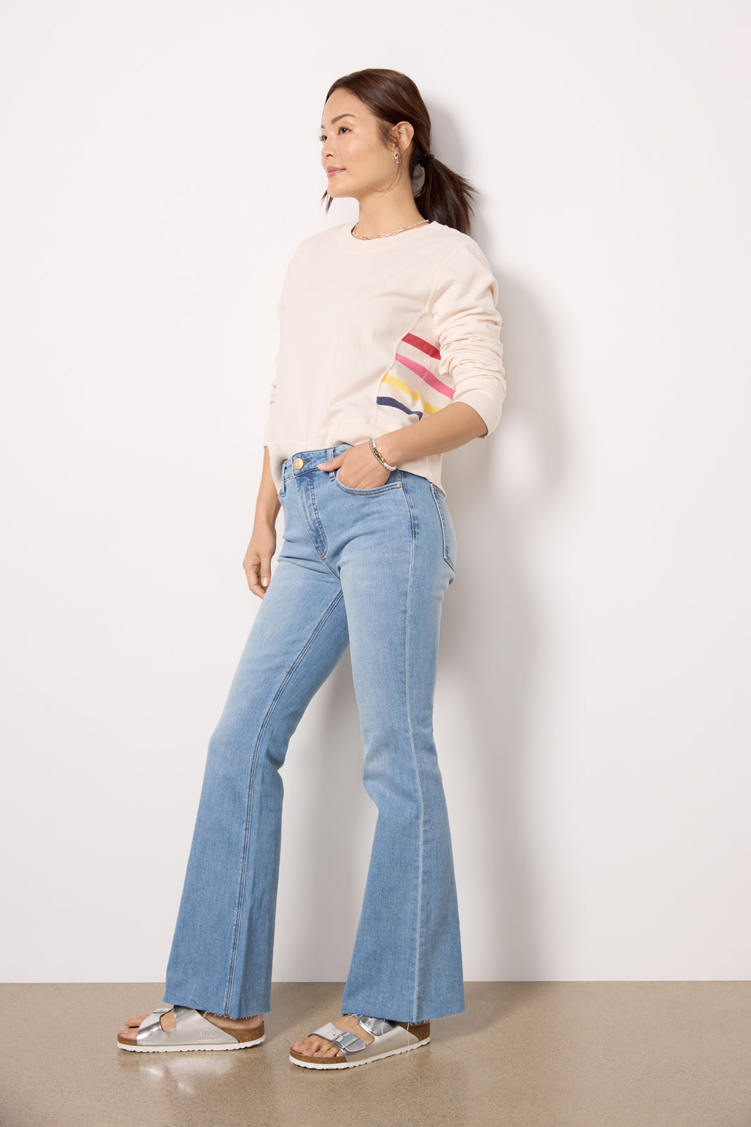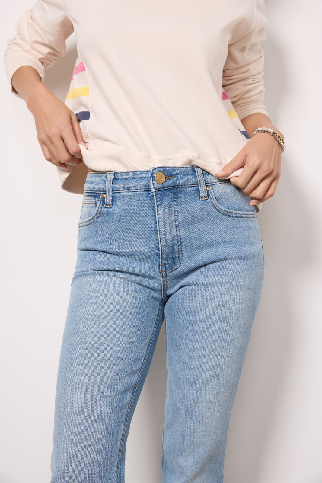 A flattering flared leg defines the Stella jean by Kut From The Kloth. crafted in comfort-stretch denim with a mid-rise fit. zipper fly closure. and raw hems. The versatile blue wash will take you from day to night. while the full-length inseam creates a legs-for-days look.