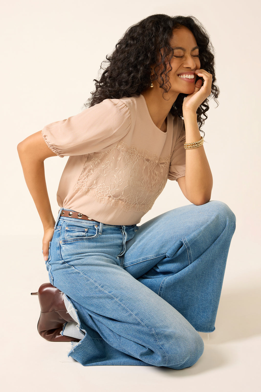 This top by Sanctuary is the perfect addition to your workwear wardrobe. featuring a crew neckline. gathered shoulders. short sleeves with elastic cuffs. and delicate lace detailing across the bodice.?