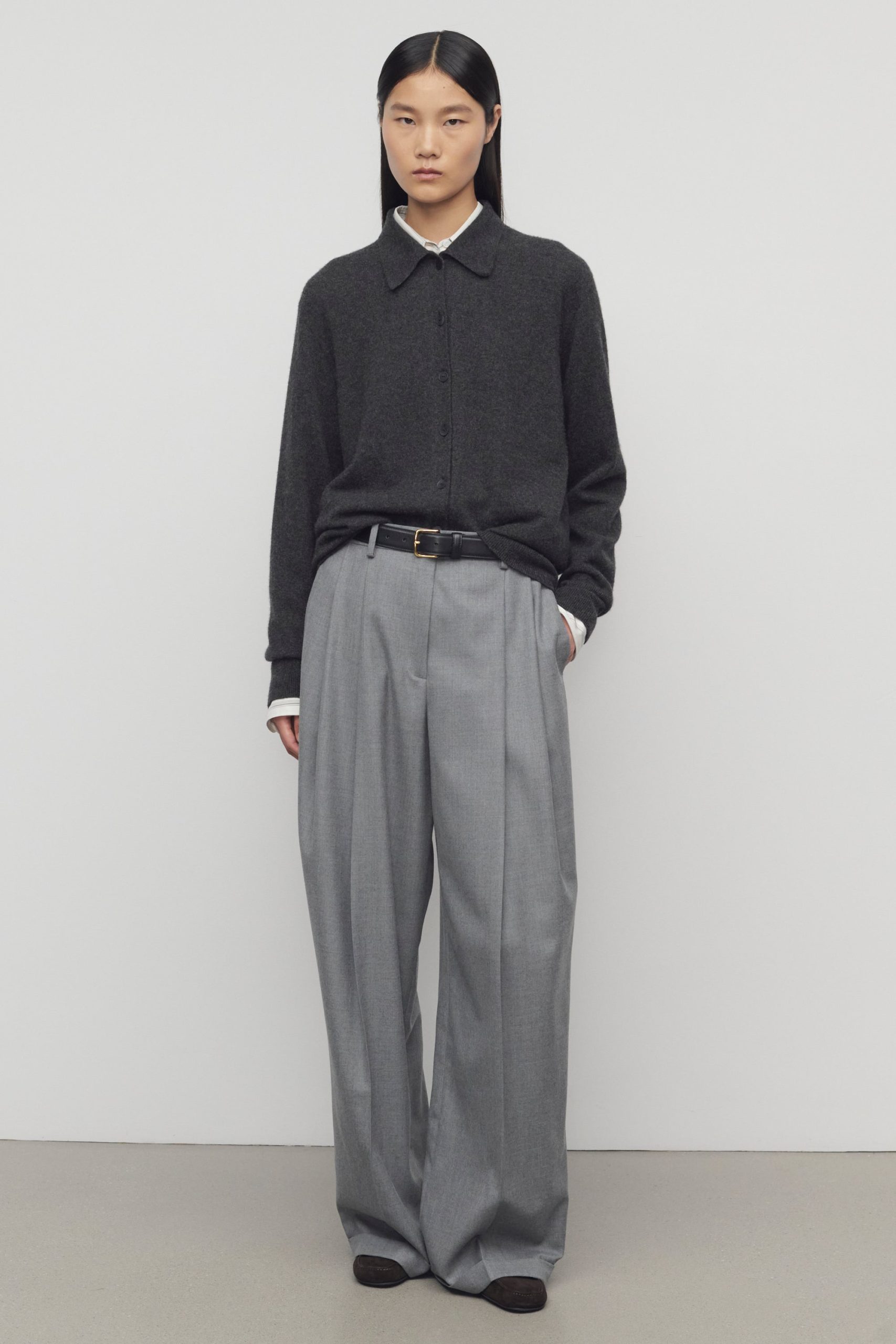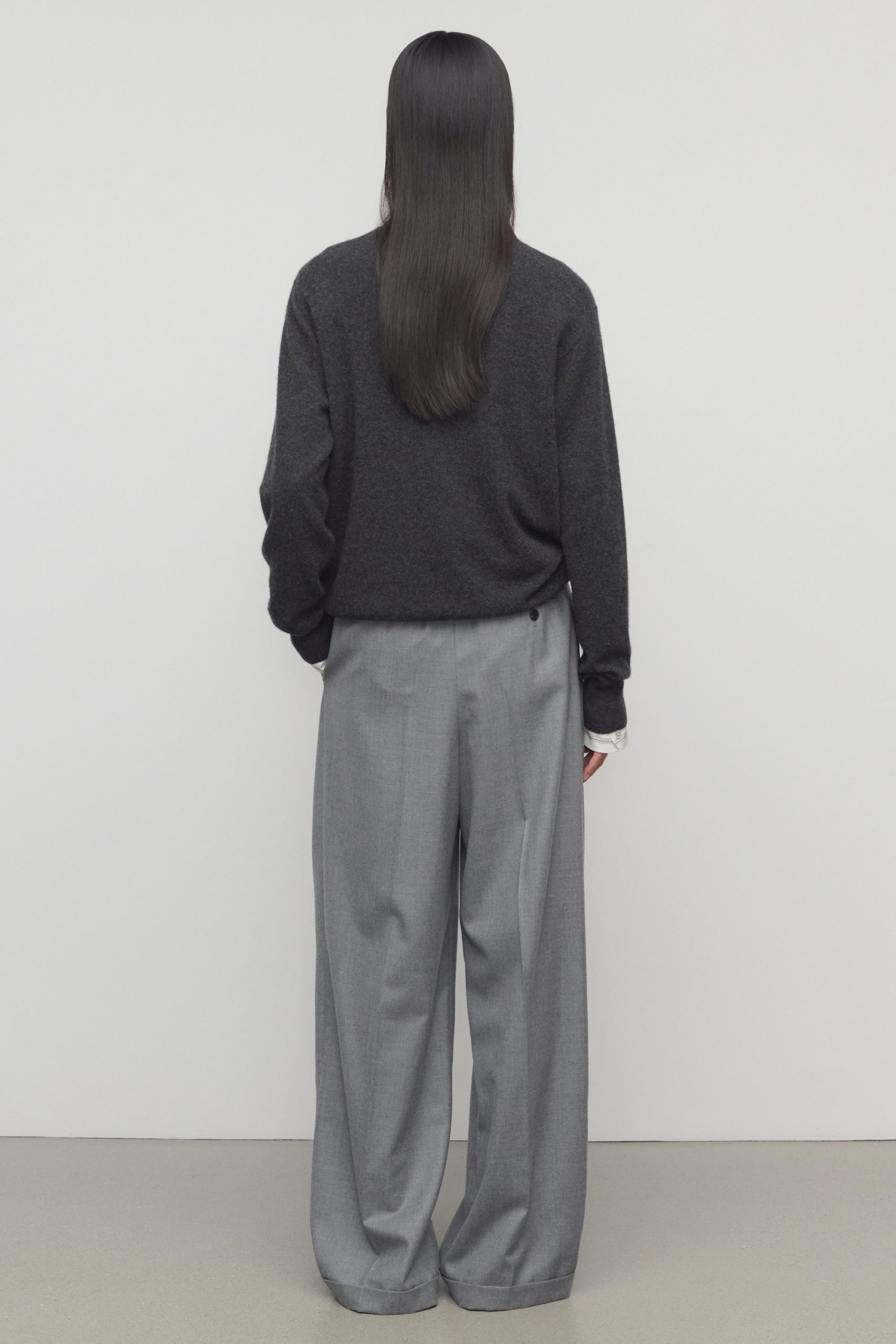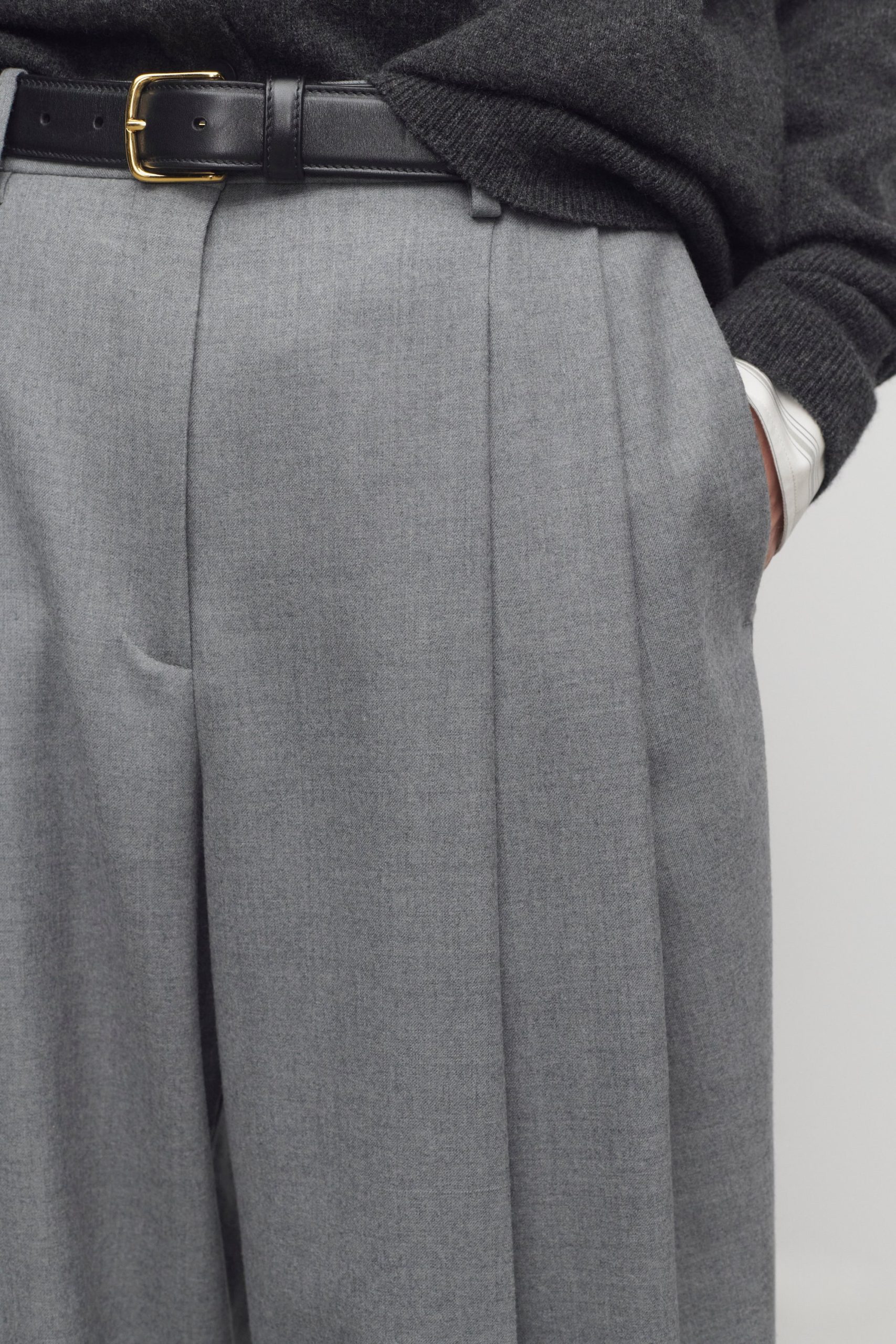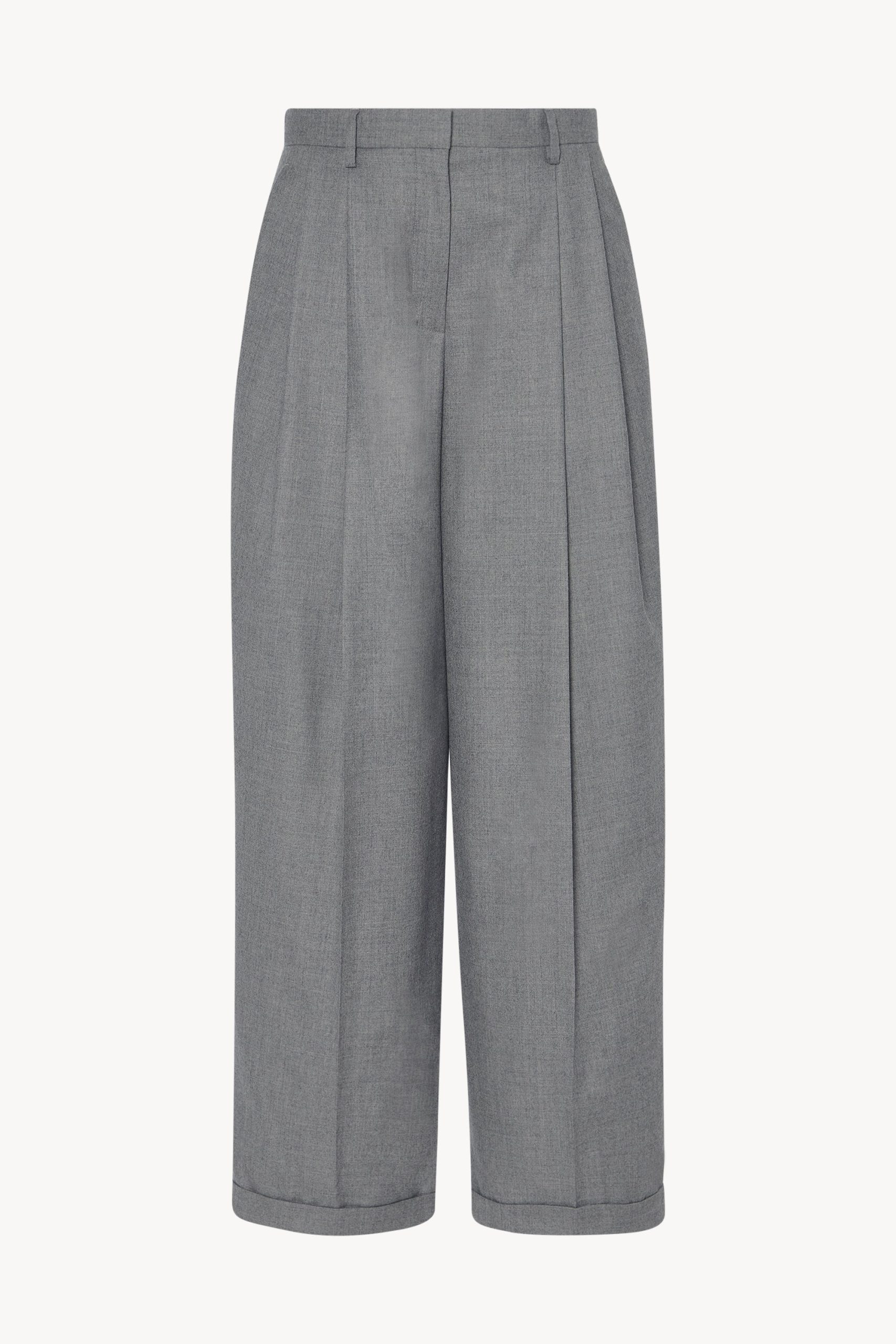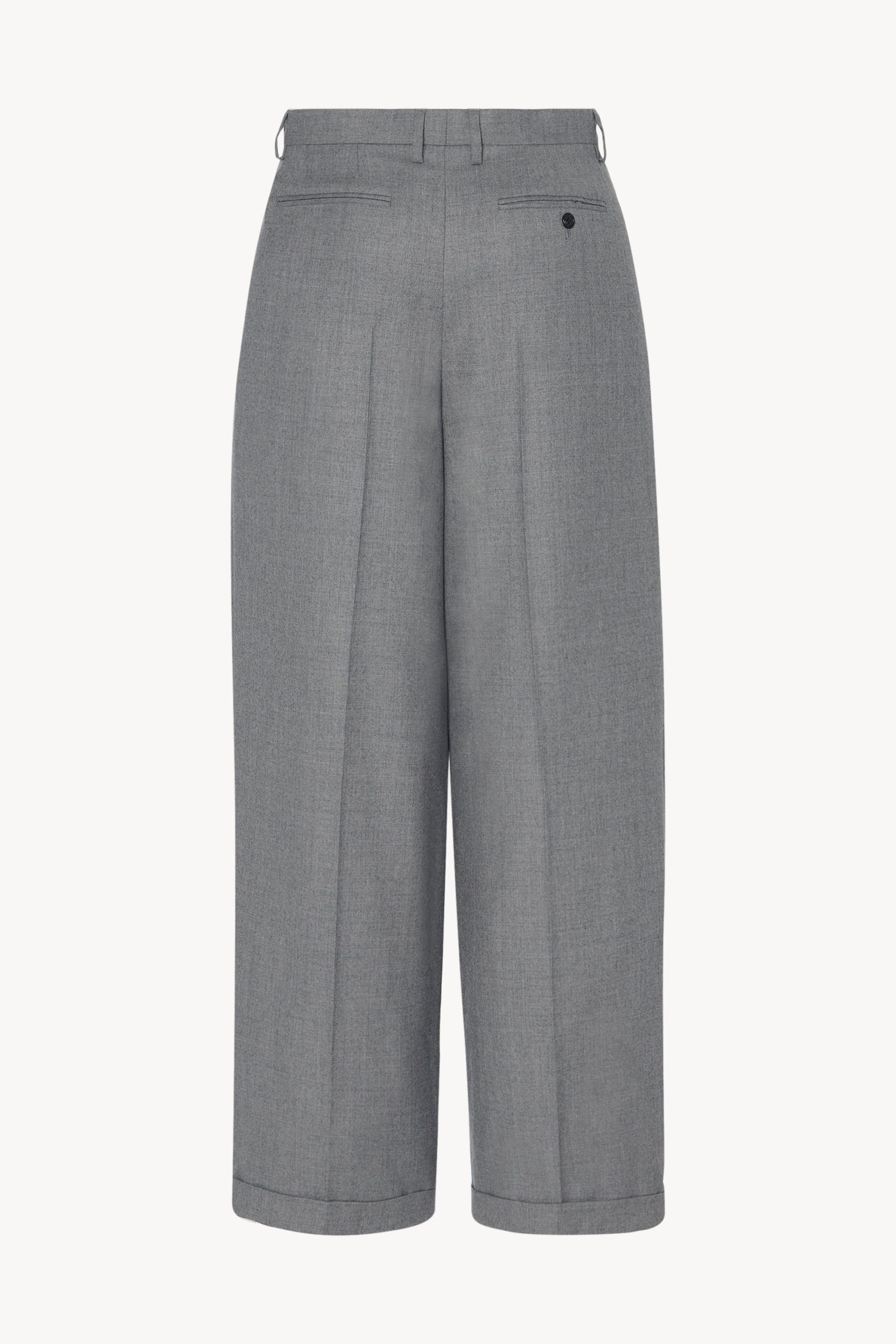 High-rise tailored trouser in virgin wool flannel with wide leg. front double pleats. and slanted side pockets.