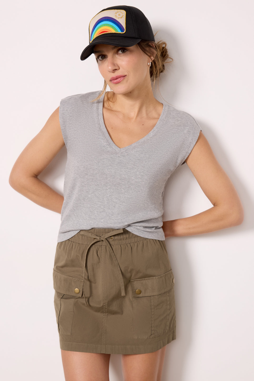 A strong shoulder design takes this Michael Stars tee up a notch. crafted in soft rib knit fabric with a v-neckline and semi-relaxed fit. Paired with skirts. jeans. or shorts. it will be your new favorite staple.