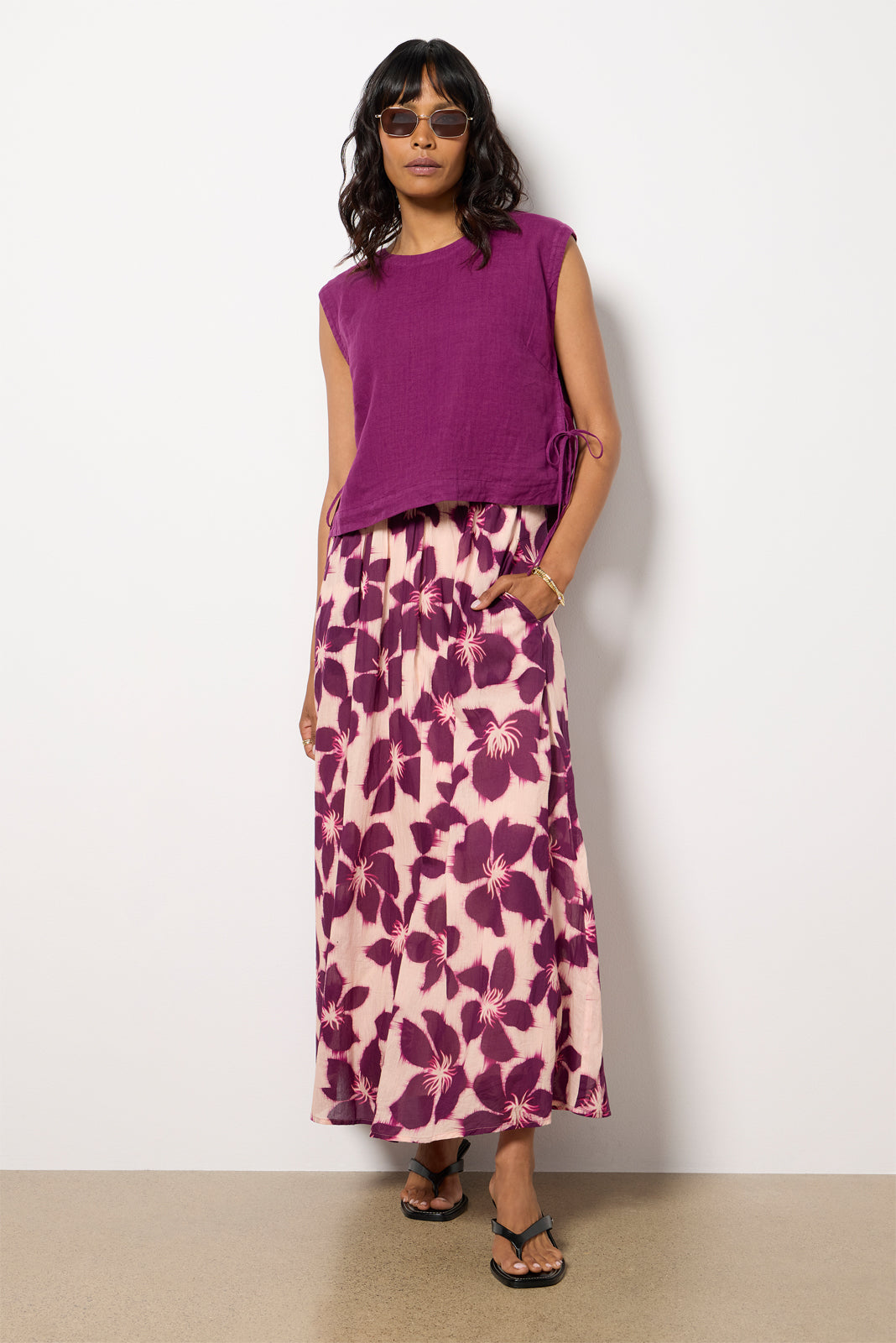 Perfect for summer. the Tavia linen top by Velvet features a relaxed. sleeveless silhouette?with a back keyhole button closure. cropped fit. and side tie details for an elevated touch.