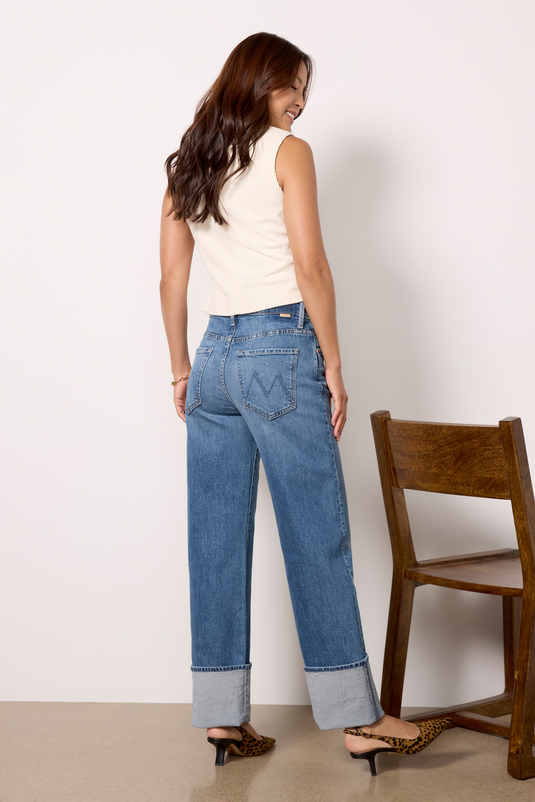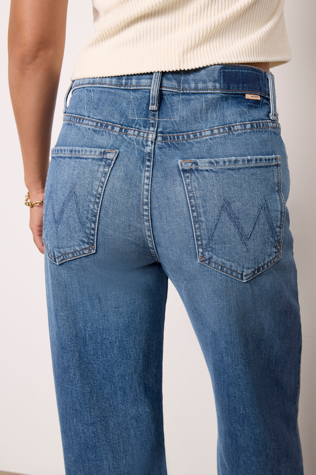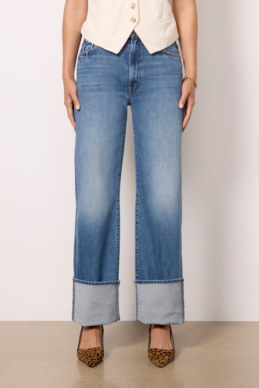 Elevate your denim collection with these wide leg jeans by MOTHER. featuring cuffed hems and a high-rise waist. Finished in a medium blue wash with fading at the knees. these jeans will take you from day to night in style.