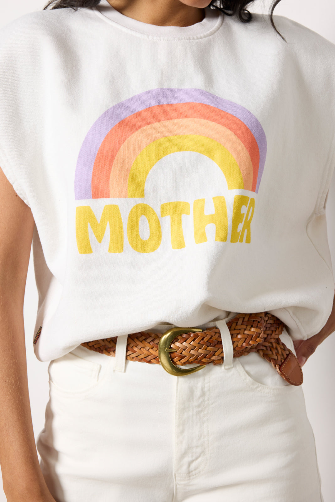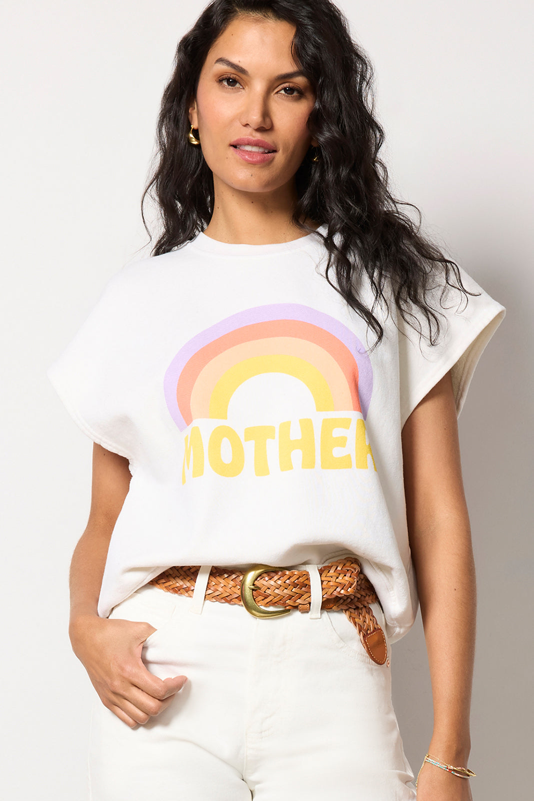 A rainbow graphic elevates this casual-cool sweatshirt by MOTHER. crafted in comfy cotton fabric with a relaxed fit. crew neckline. and short dolman sleeves.