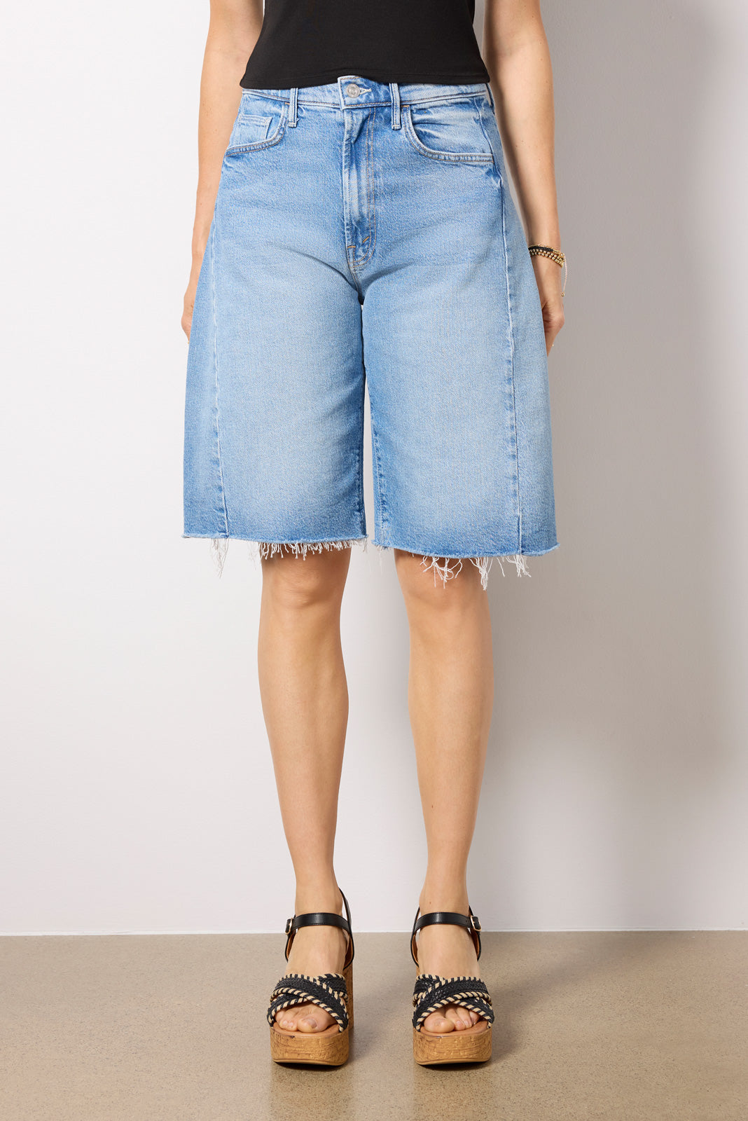 Effortlessly stylish. these high-rise bermuda jean shorts by MOTHER are crafted from semi-rigid denim and feature a relaxed wide leg. knee-length inseam. and raw hems.