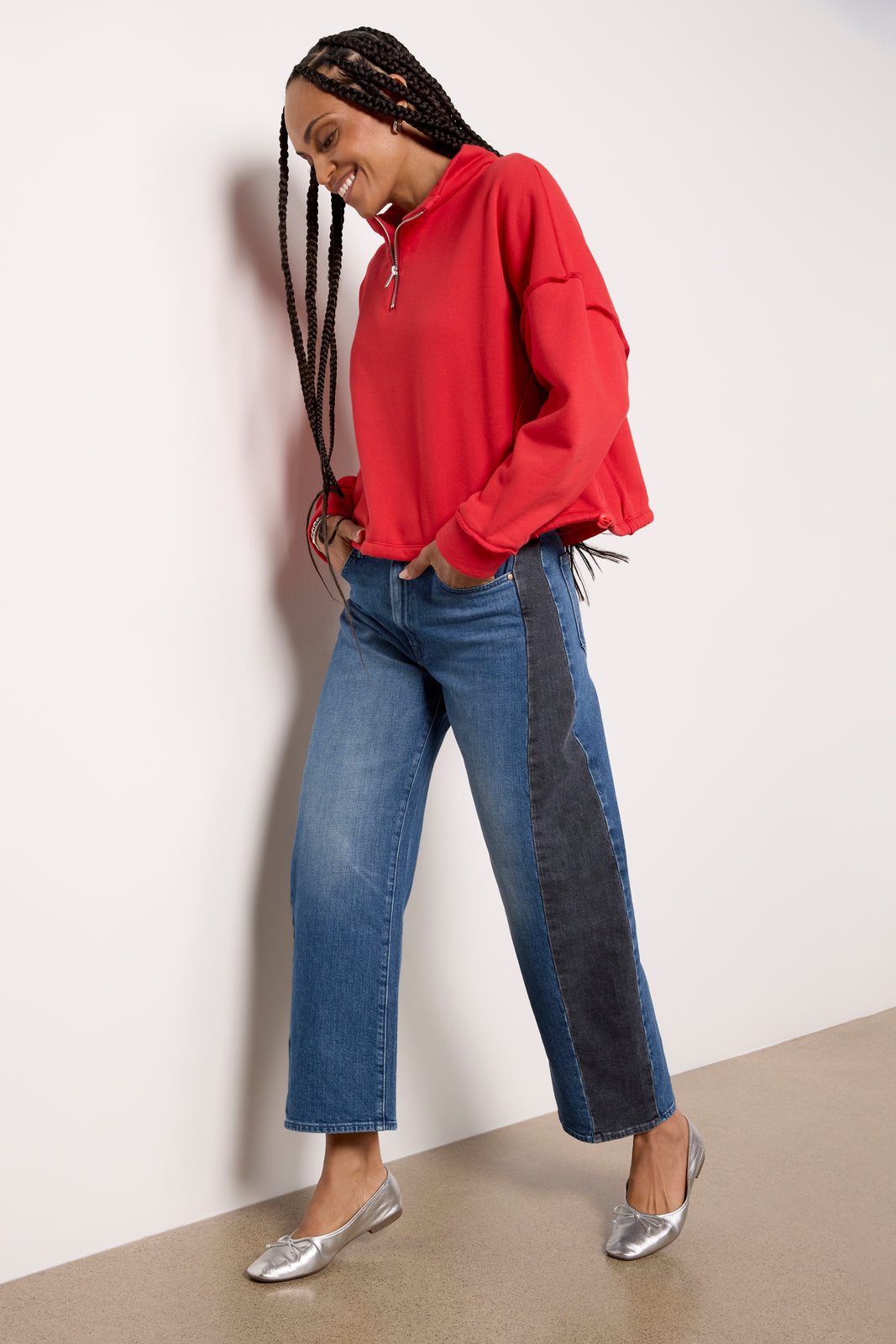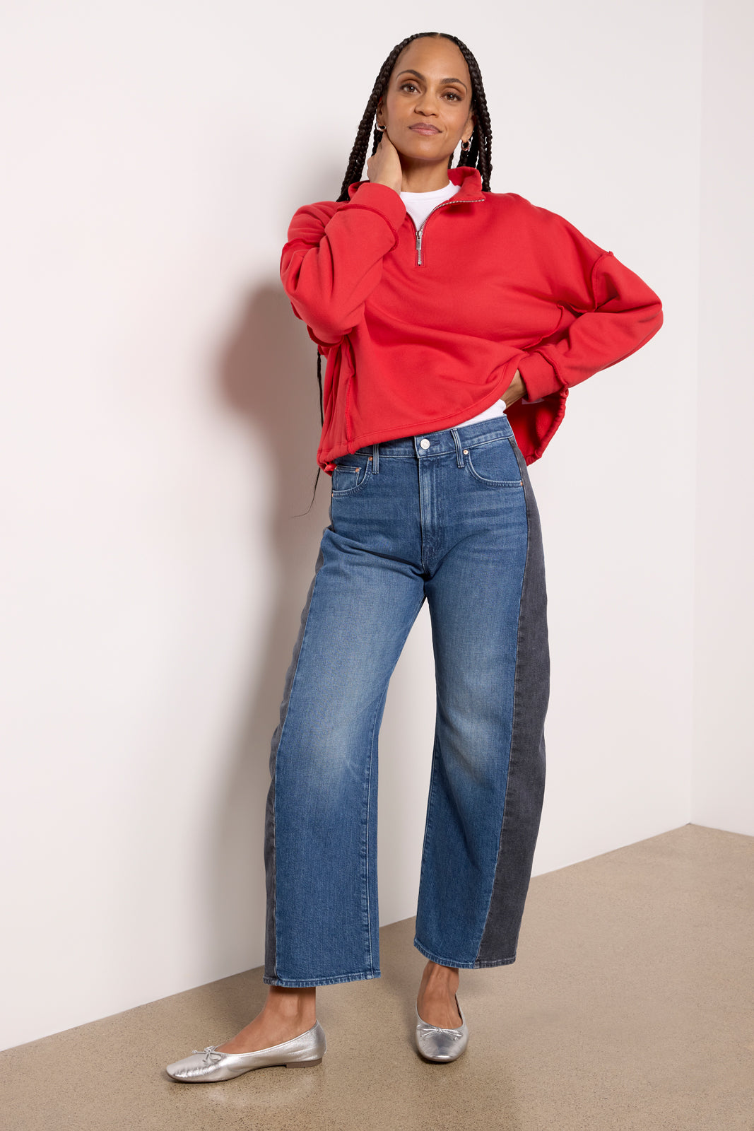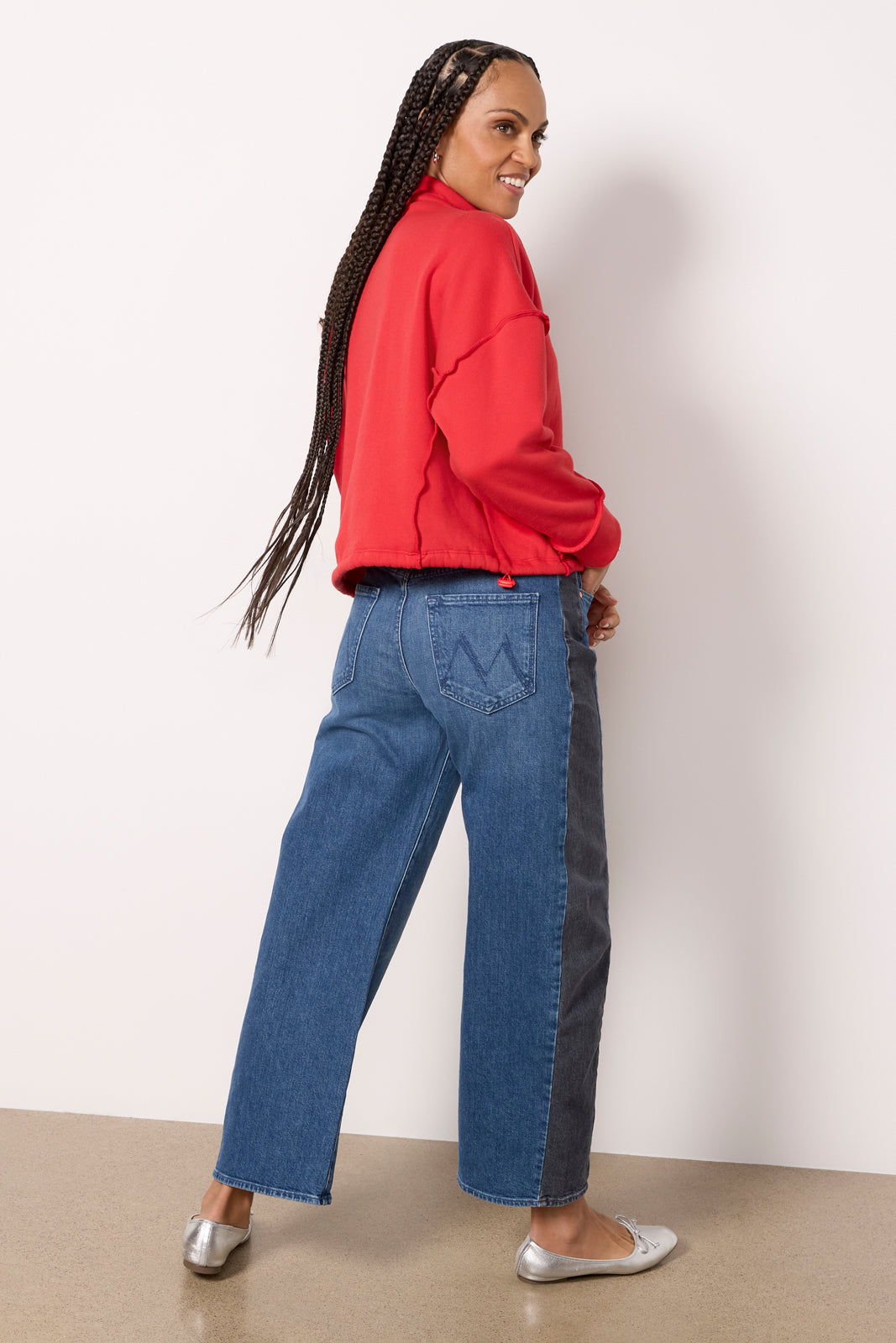 Update your denim collection with The Half Pipe Flood jean by MOTHER. These stylish barrel jeans feature a high-rise fit. curved leg. andĀ faded black side panels for a two-tone design.