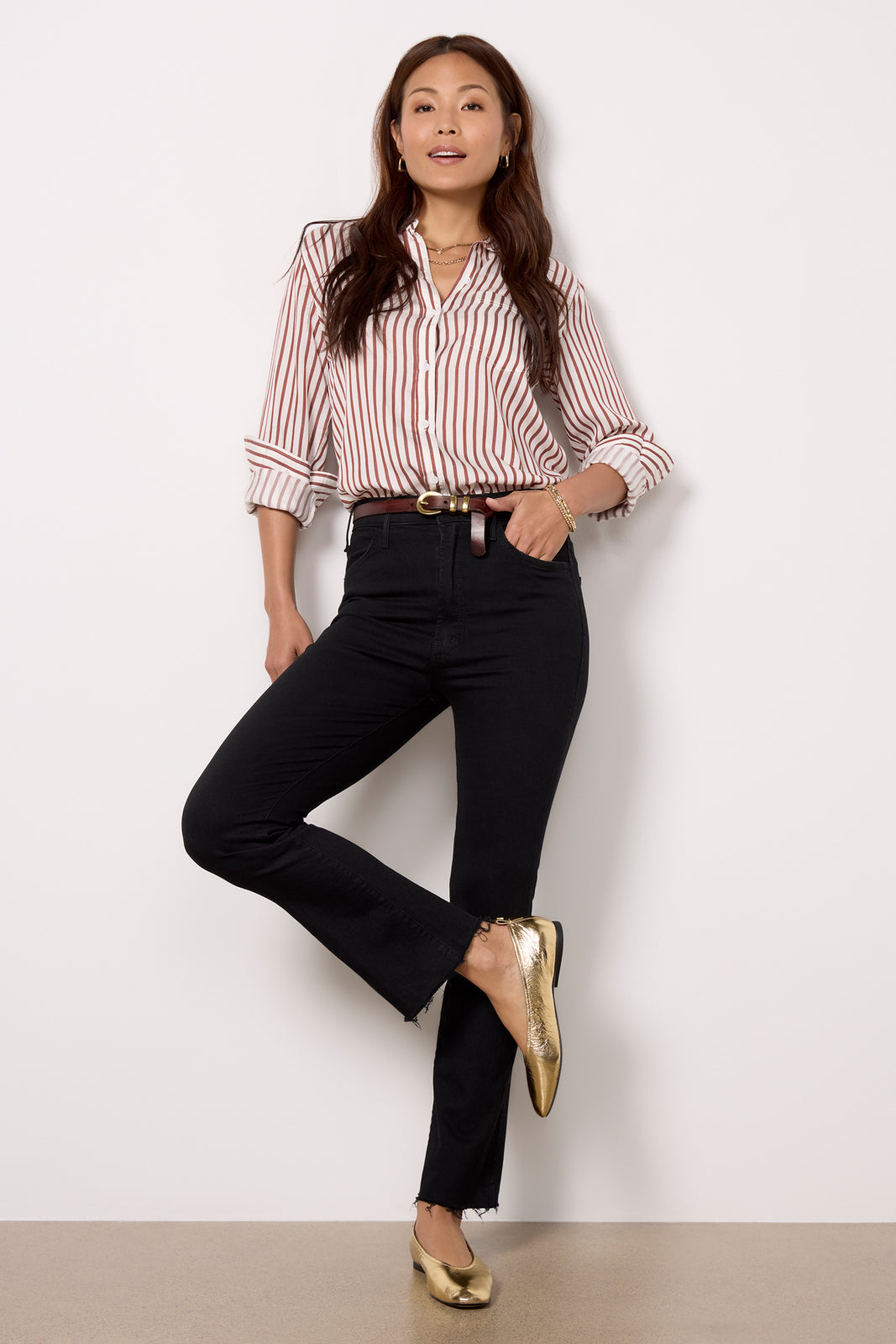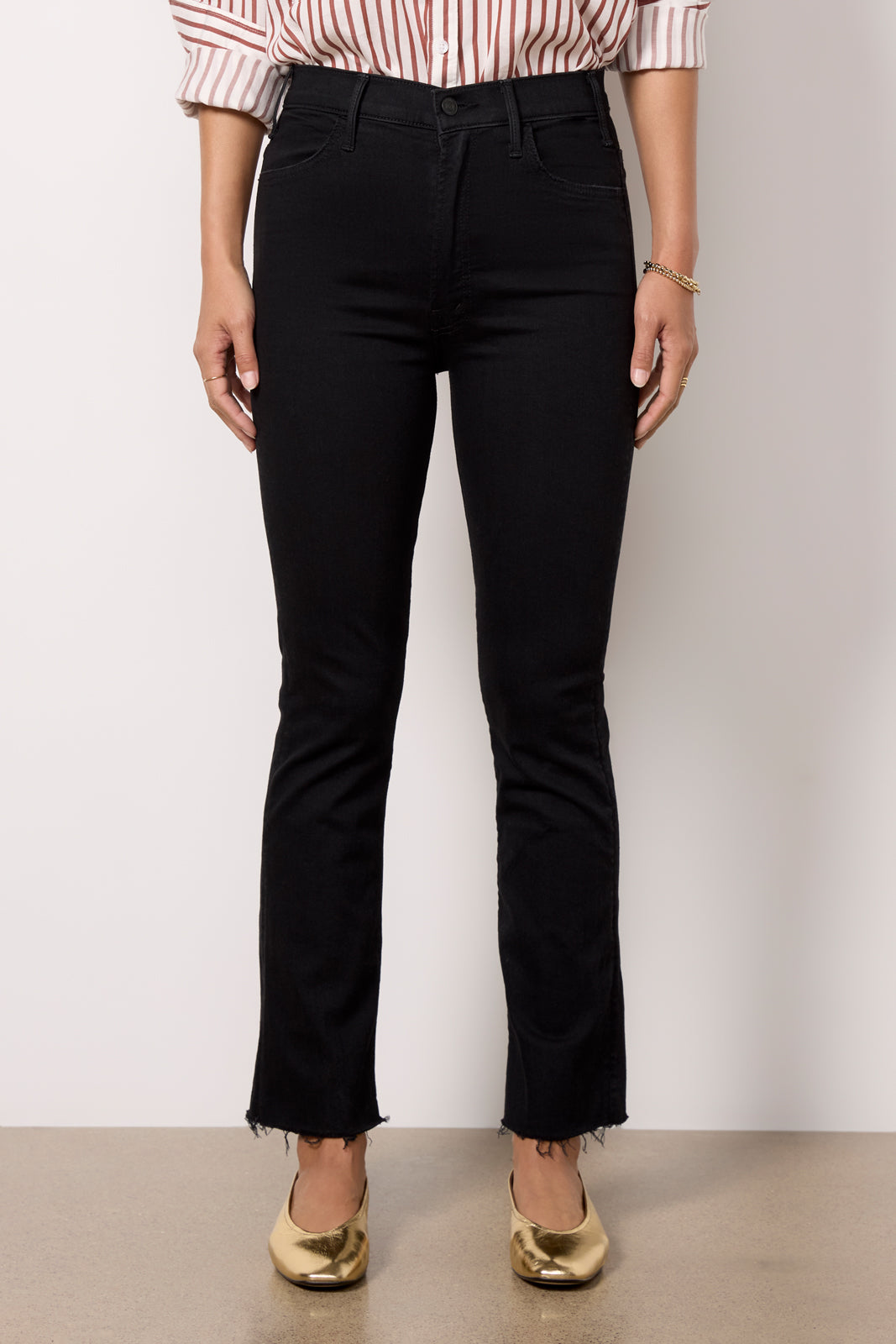 A versatile black wash and subtly flared hems define The Hustler Ankle Fray jean by MOTHER. featuring a high-rise fit. raw hems. and soft stretch denim fabric. They’ll be your new go-to with everything from graphic tees to a blouse and blazer.