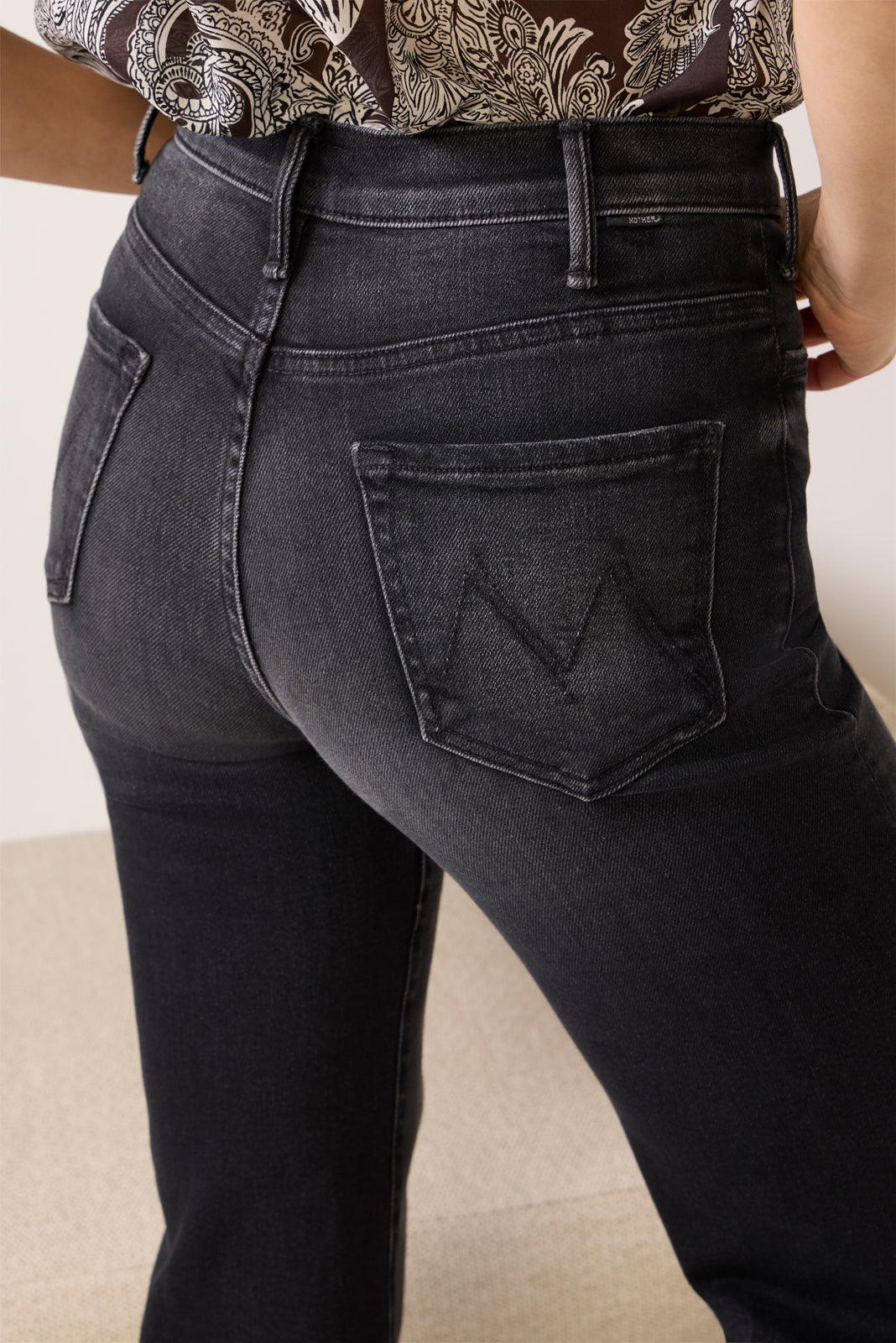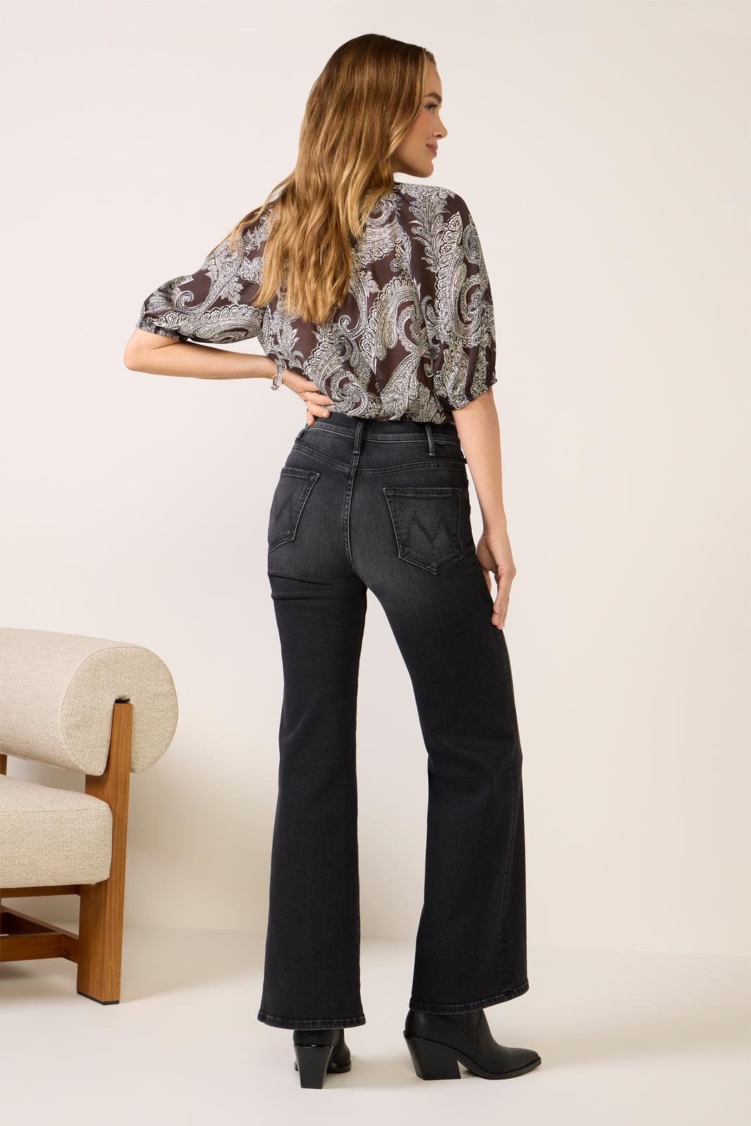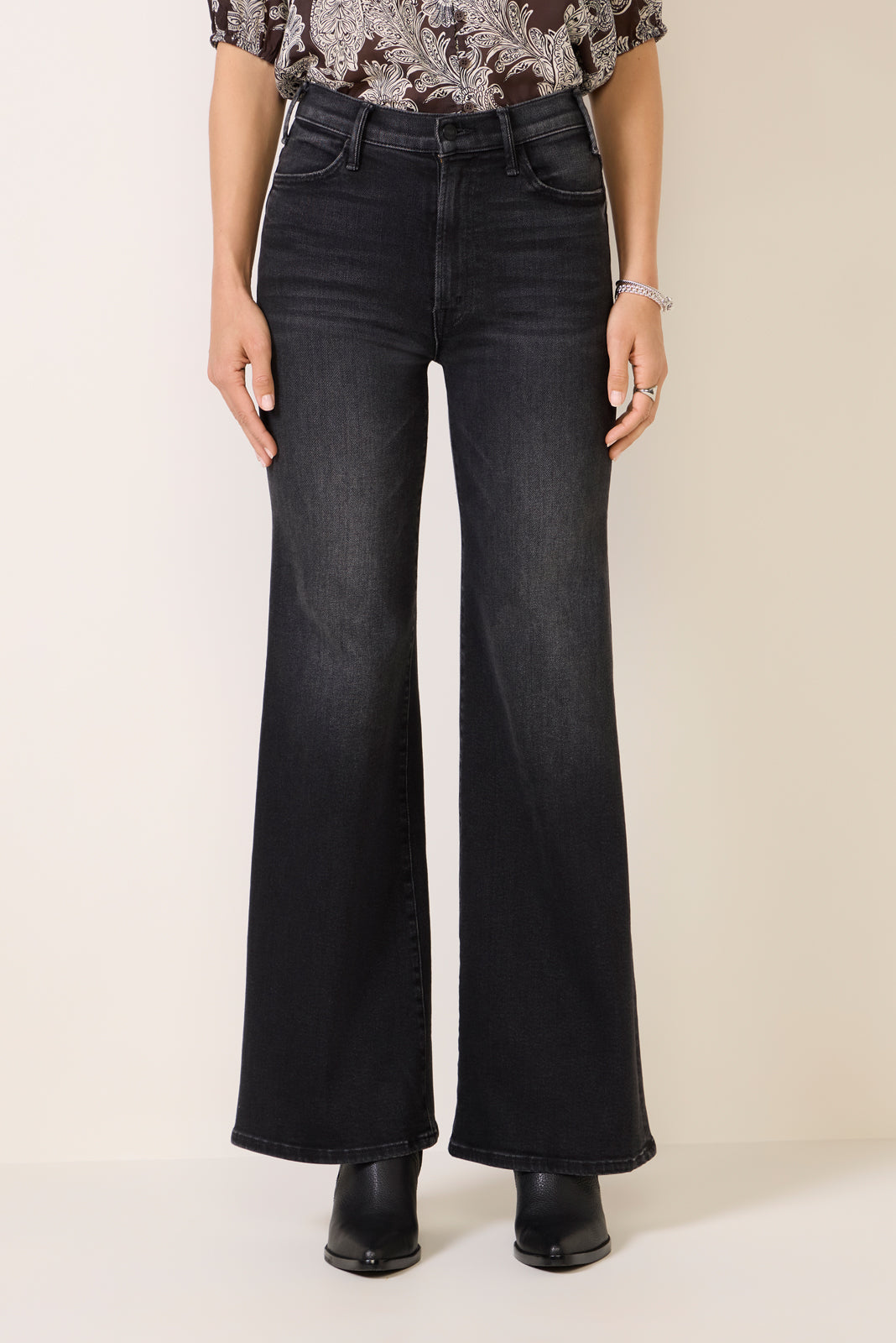 Elevate your denim collection with these ’70s-inspired wide leg jeans by MOTHER. featuring a high-rise silhouette. full-length inseam. and soft stretch denim in a faded black wash.
