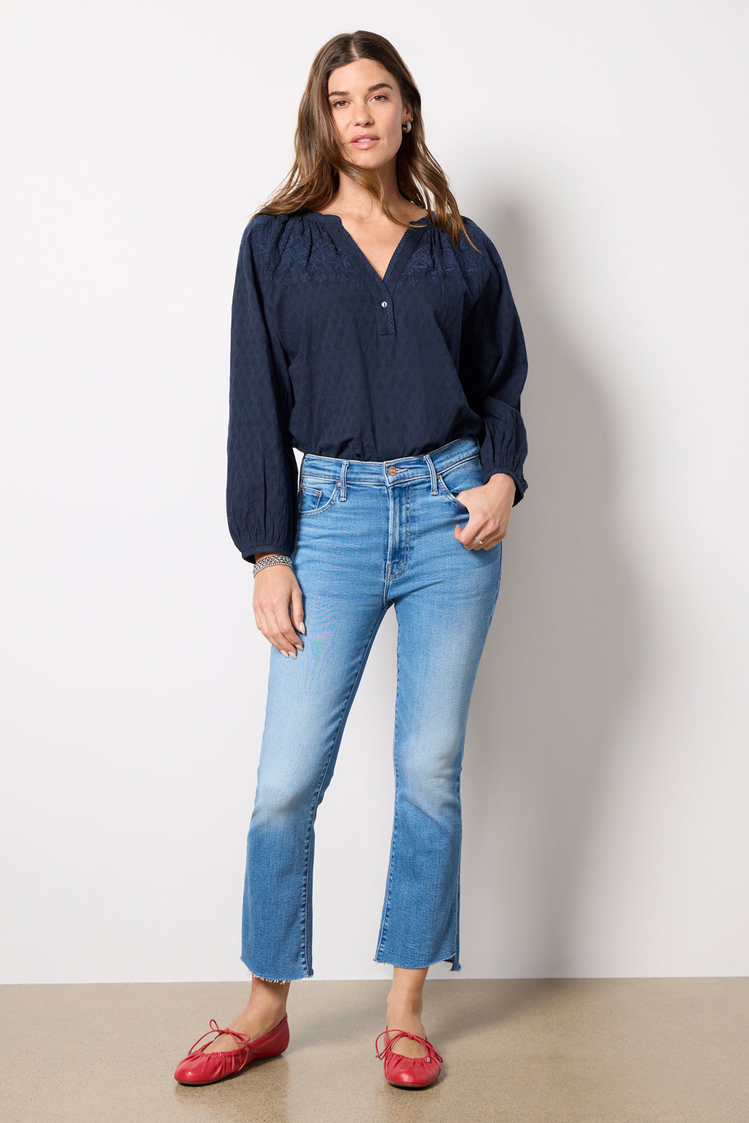 Top off your denim collection with The Insider Crop Step Fray bootcut jean by MOTHER. These versatile jeans are crafted in soft stretch denim with a cropped length. faded blue wash. and raw step hems.