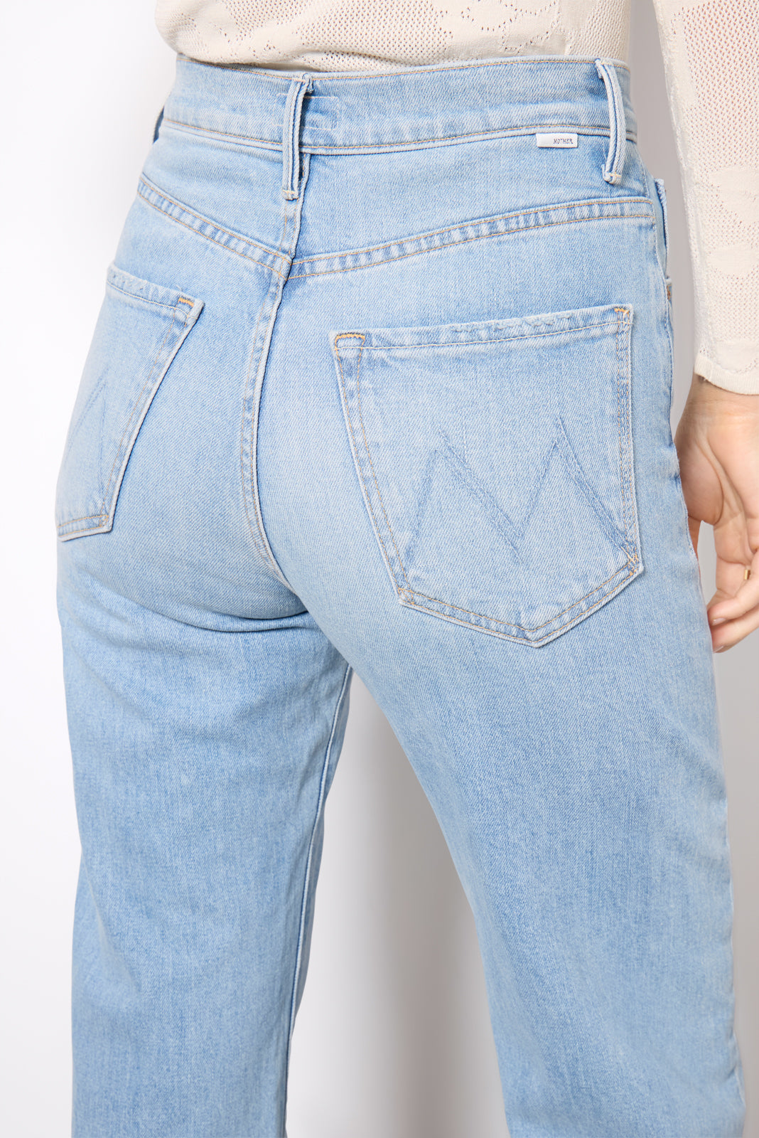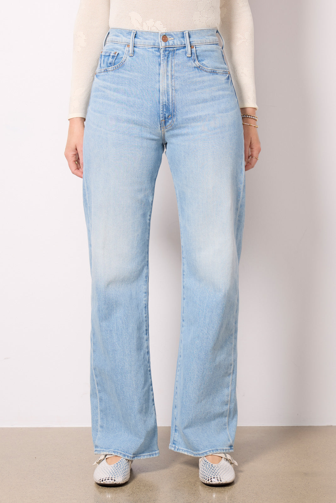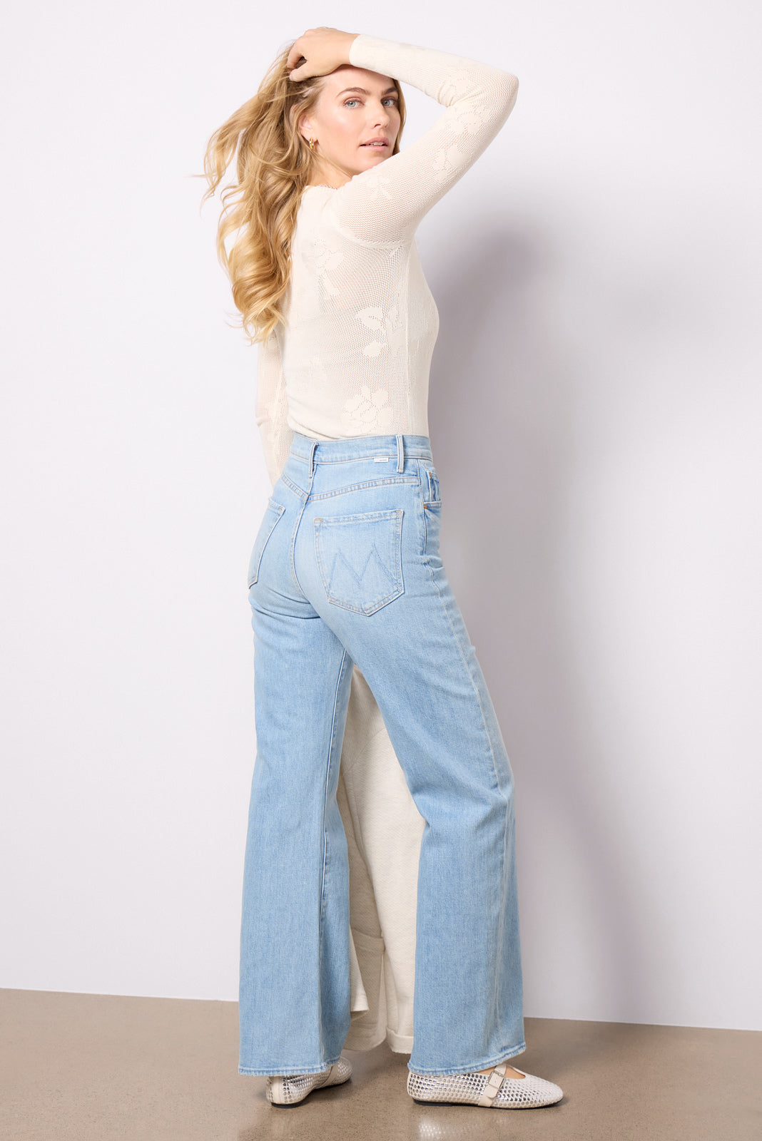 Finished in a light blue wash. The Lasso Sneak jean from Mother features a wide-leg silhouette. a high-rise waist. a full-length inseam. and soft stretch denim for day-to-night wear.