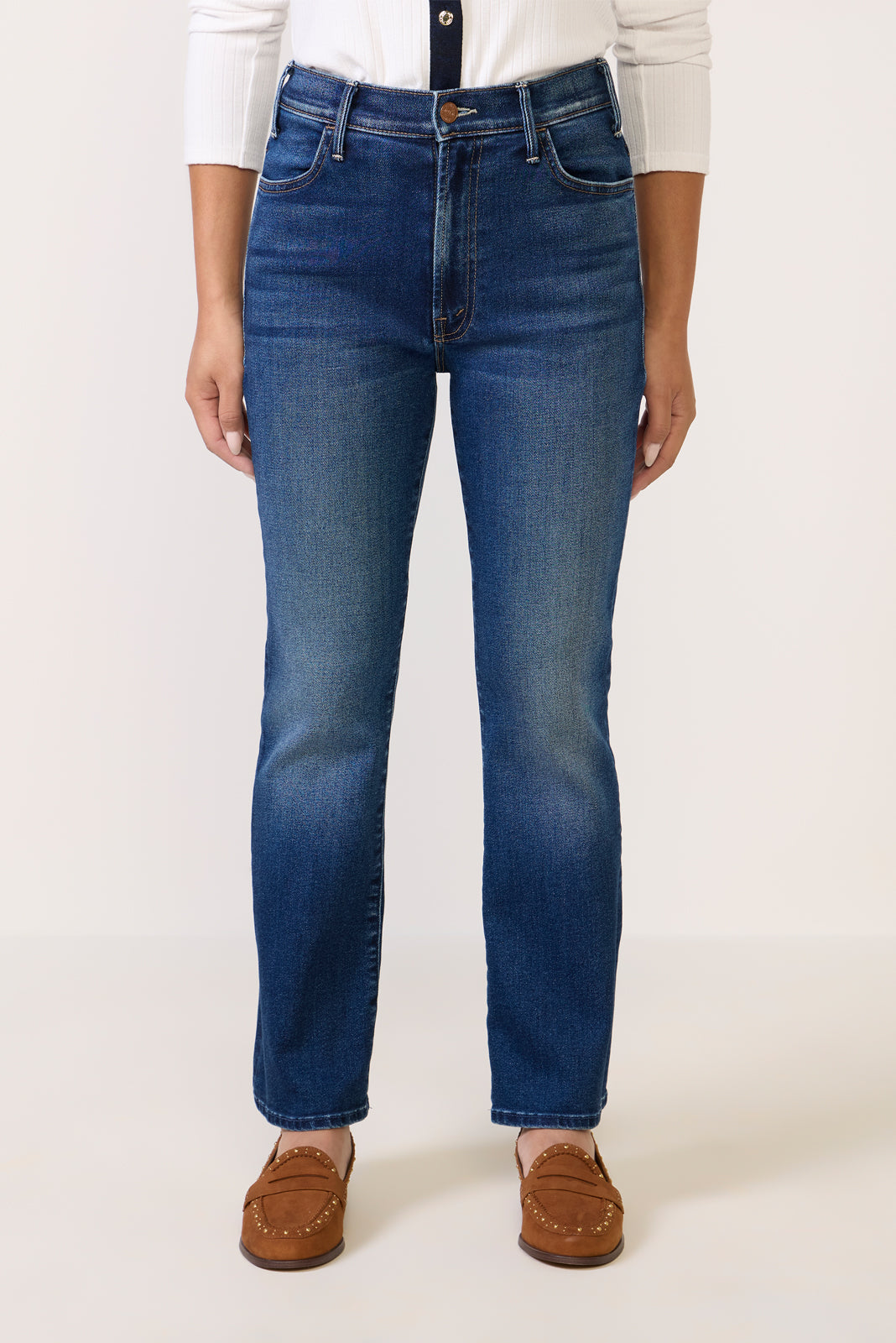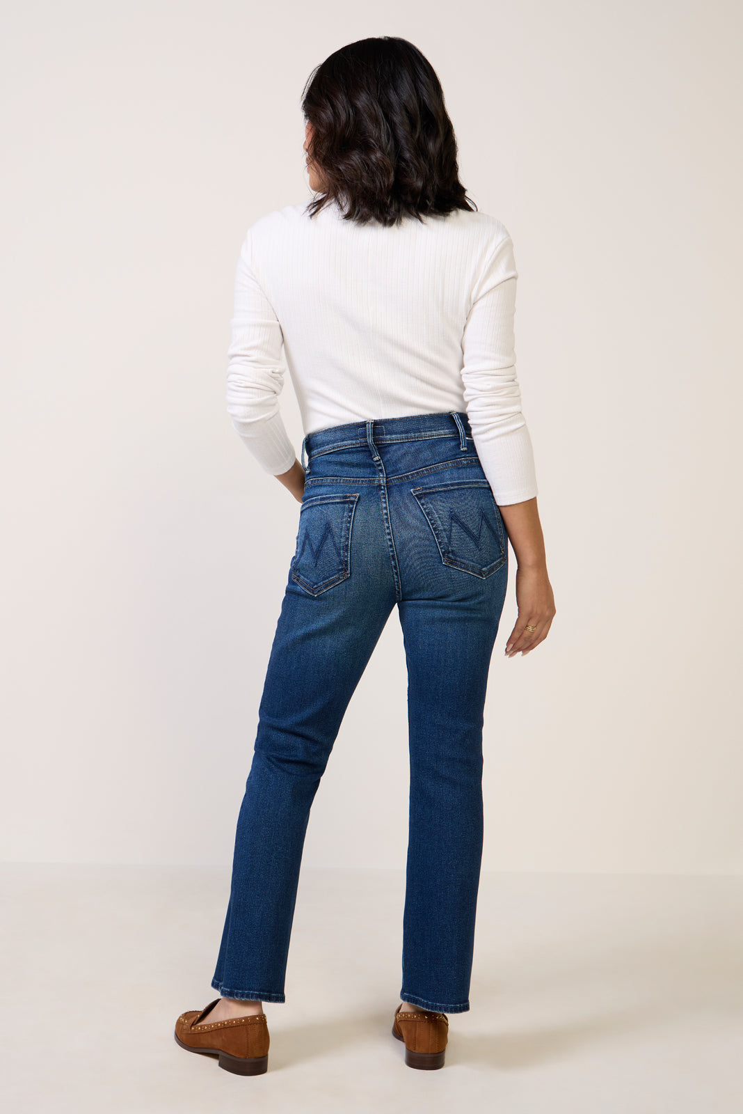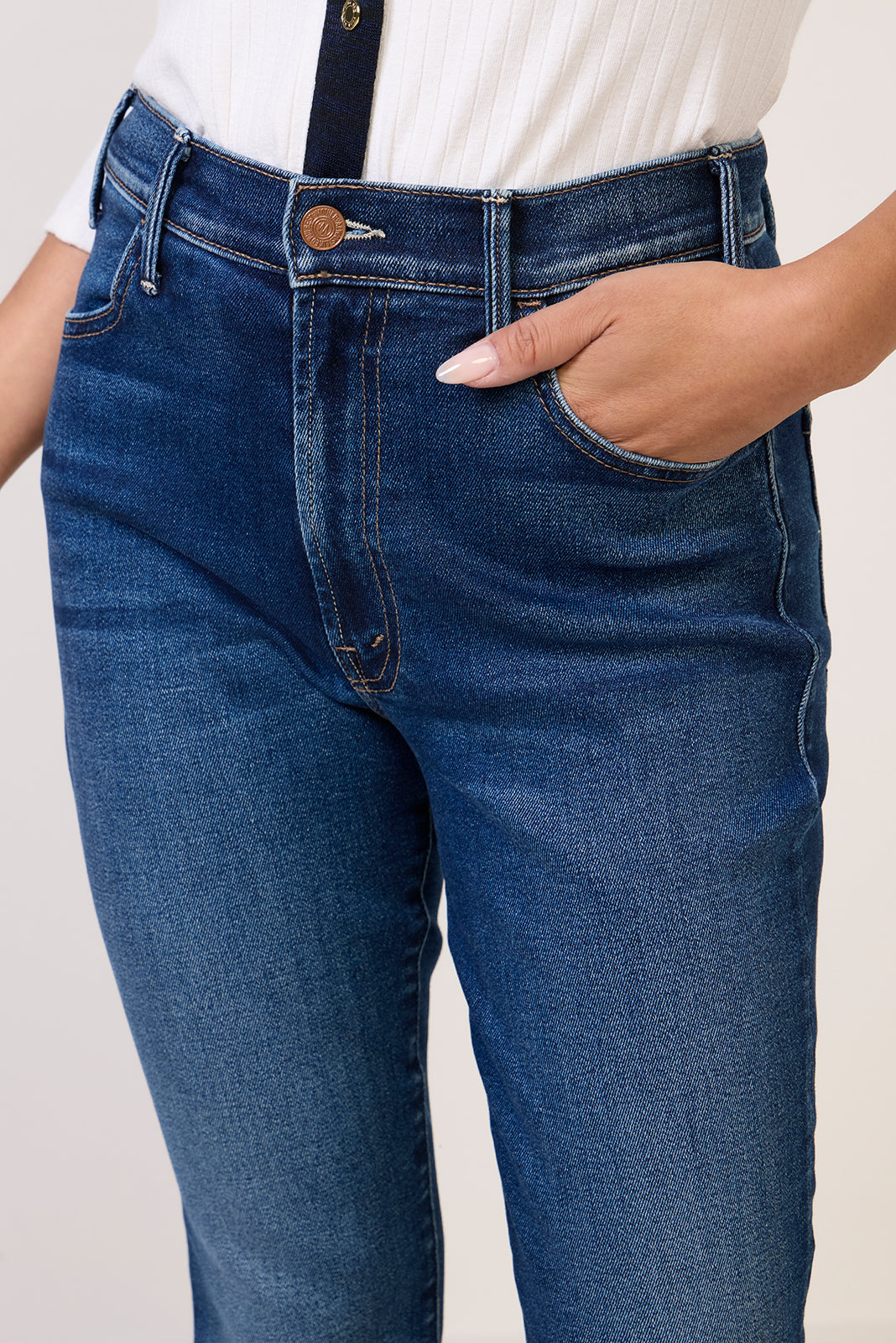 Finished in a faded dark blue wash. the Petite Lil’ Hustler flare jean by MOTHER is crafted from soft stretch denim with a high-rise fit and ankle-length hems.?Designed to complement petite body types. these jeans feature a higher knee placement. shorter inseam. and shorter rise for a perfect. always-flattering fit.