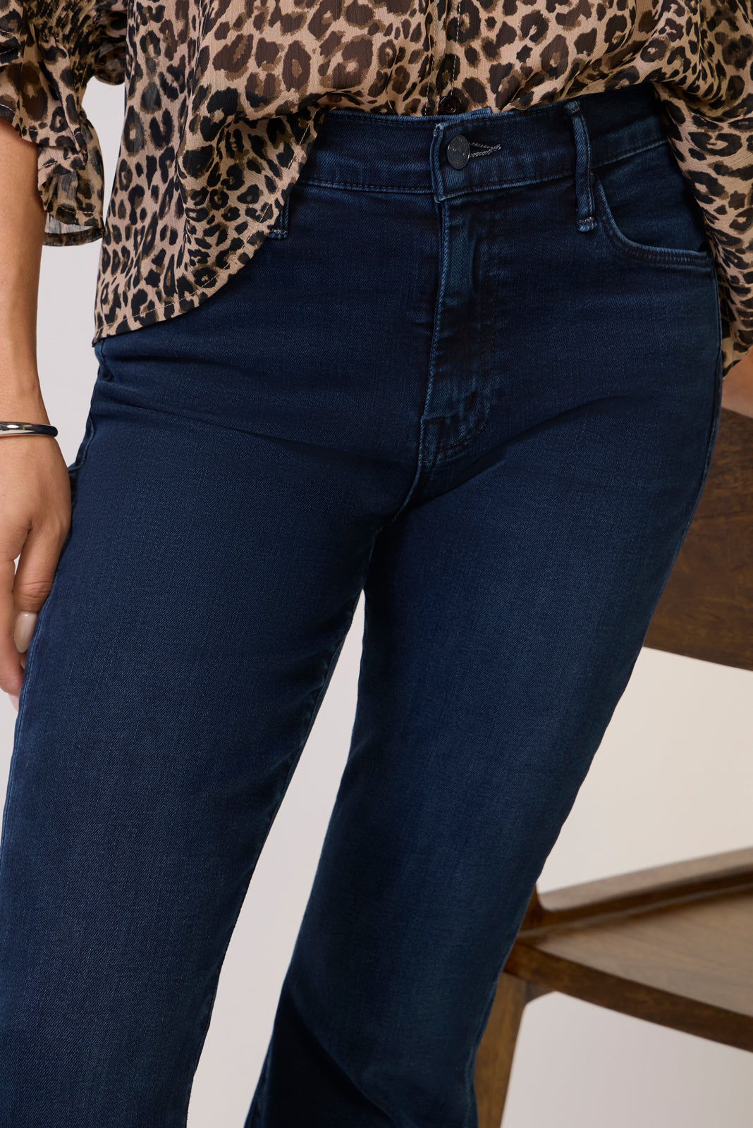 The Lil Weekender is a petite version of MOTHER’s signature flared jean. featuring a mid-rise waist. frayed hems. and soft dark-wash denim with a touch of stretch. Designed to complement petite body types. these jeans feature a higher knee placement. shorter inseam. and shorter rise for a perfect. always-flattering fit.