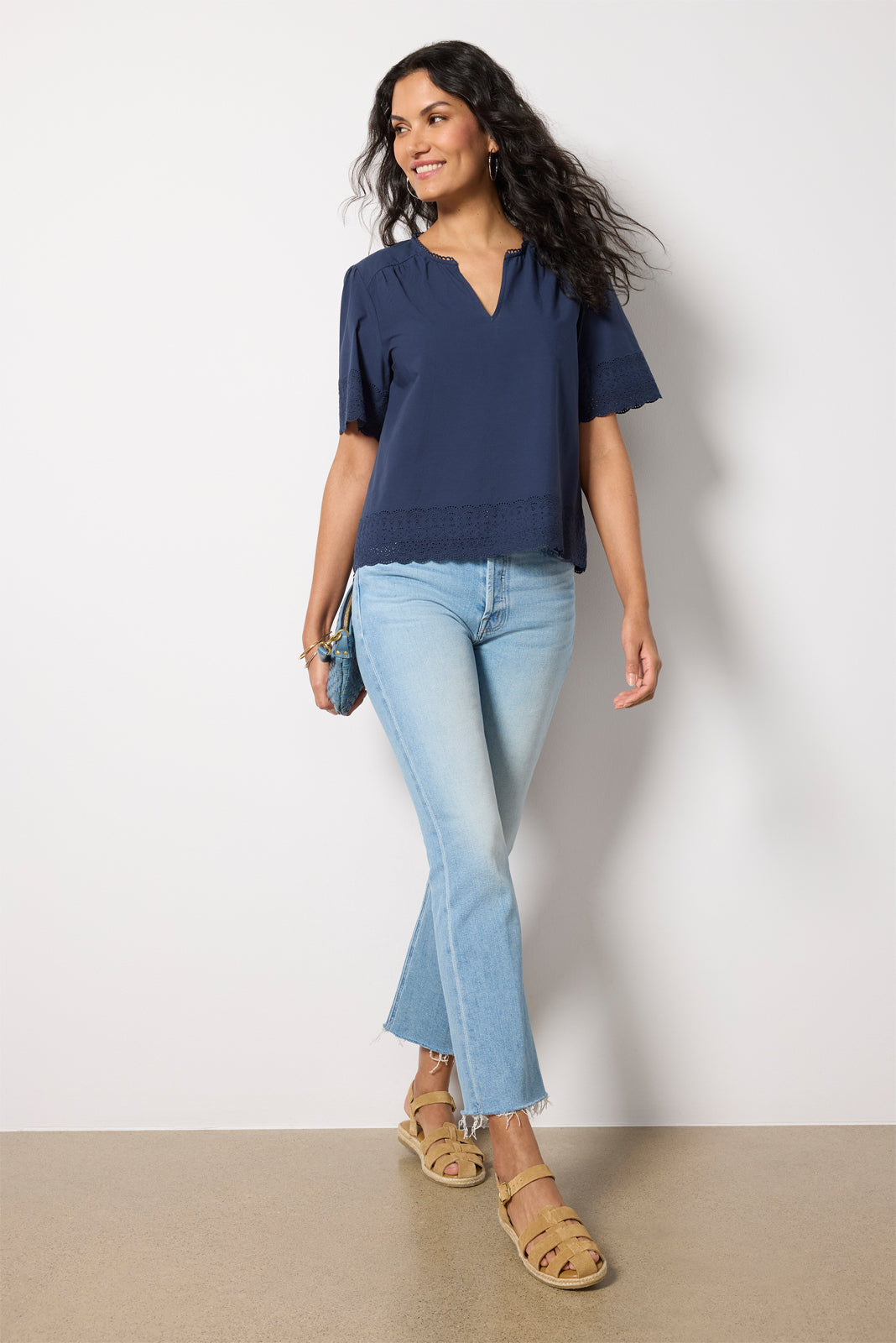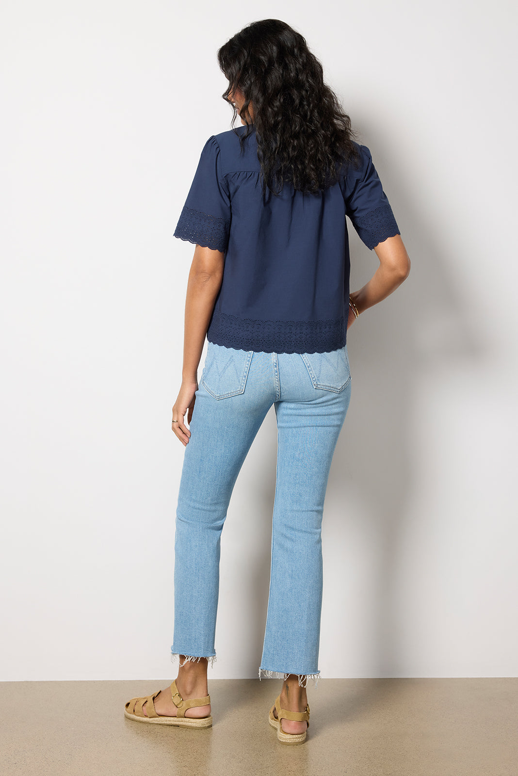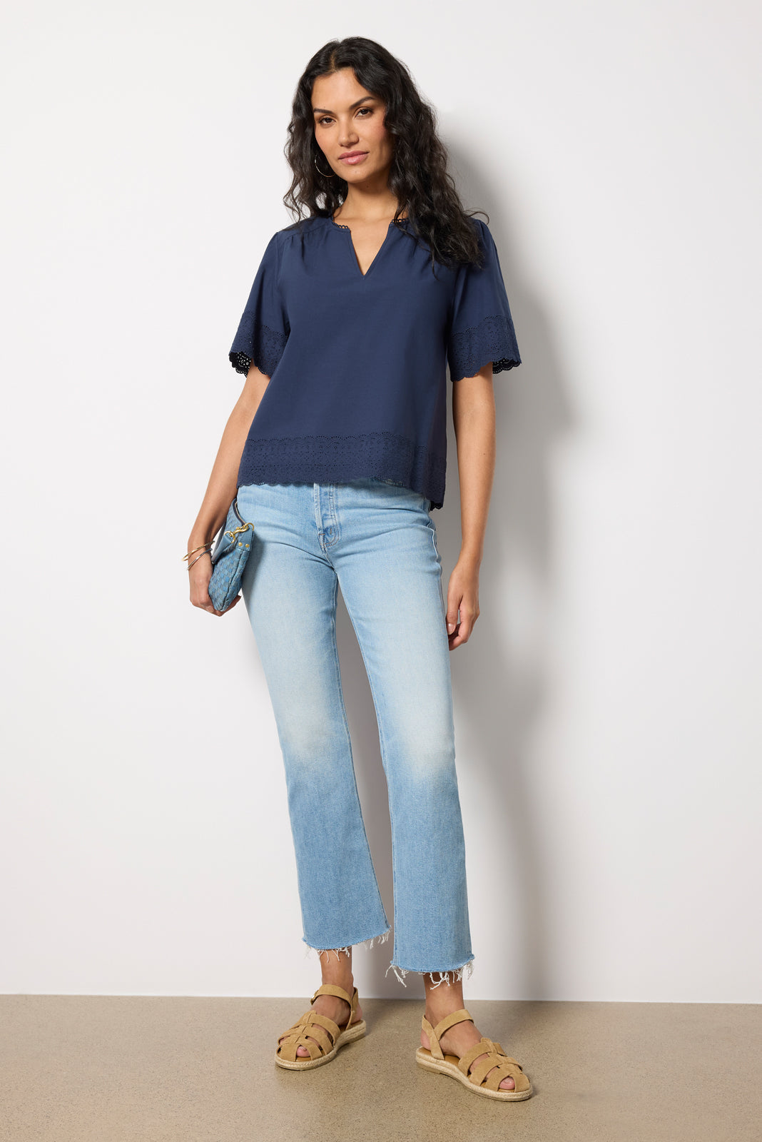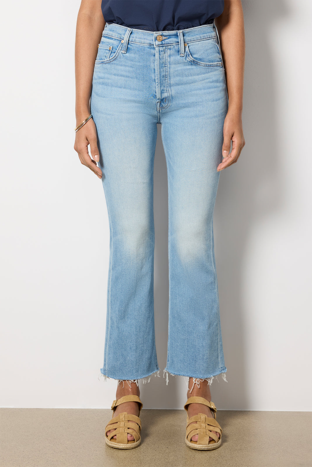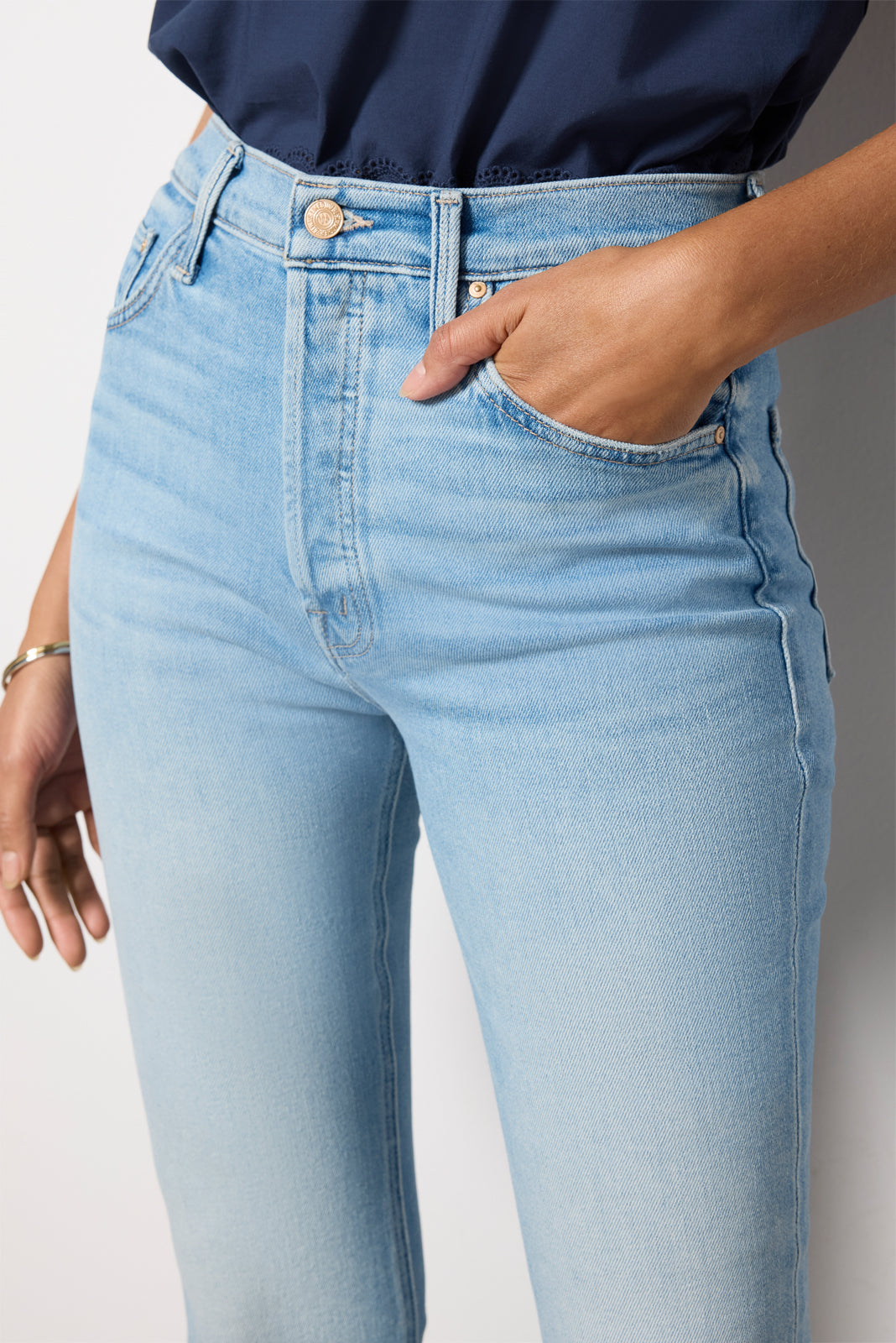 A versatile denim staple. the Tripper Flood?jean by MOTHER features a straight leg silhouette with a high-rise waist. raw hems. and a light?blue wash that’s perfect for dressing up or down.