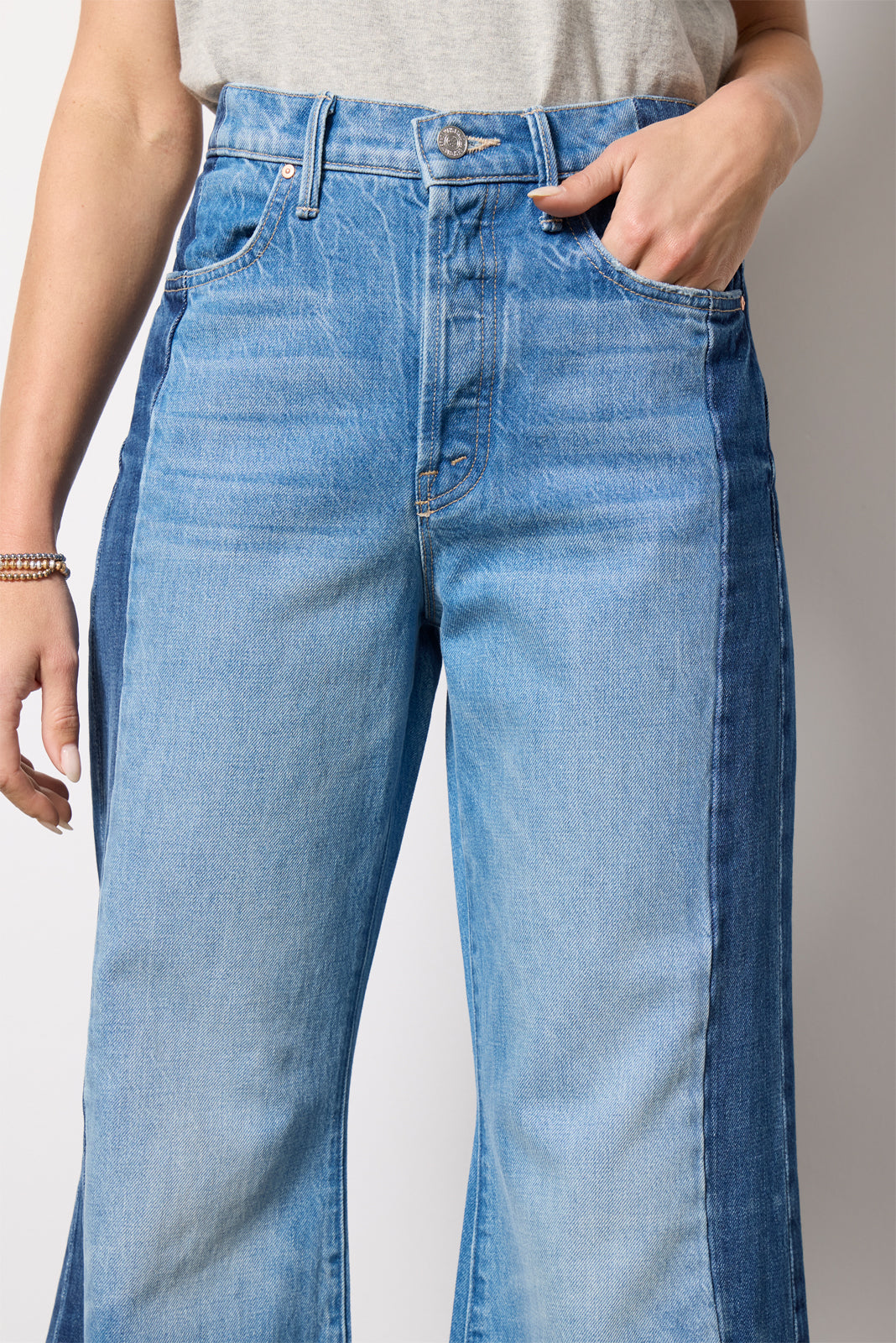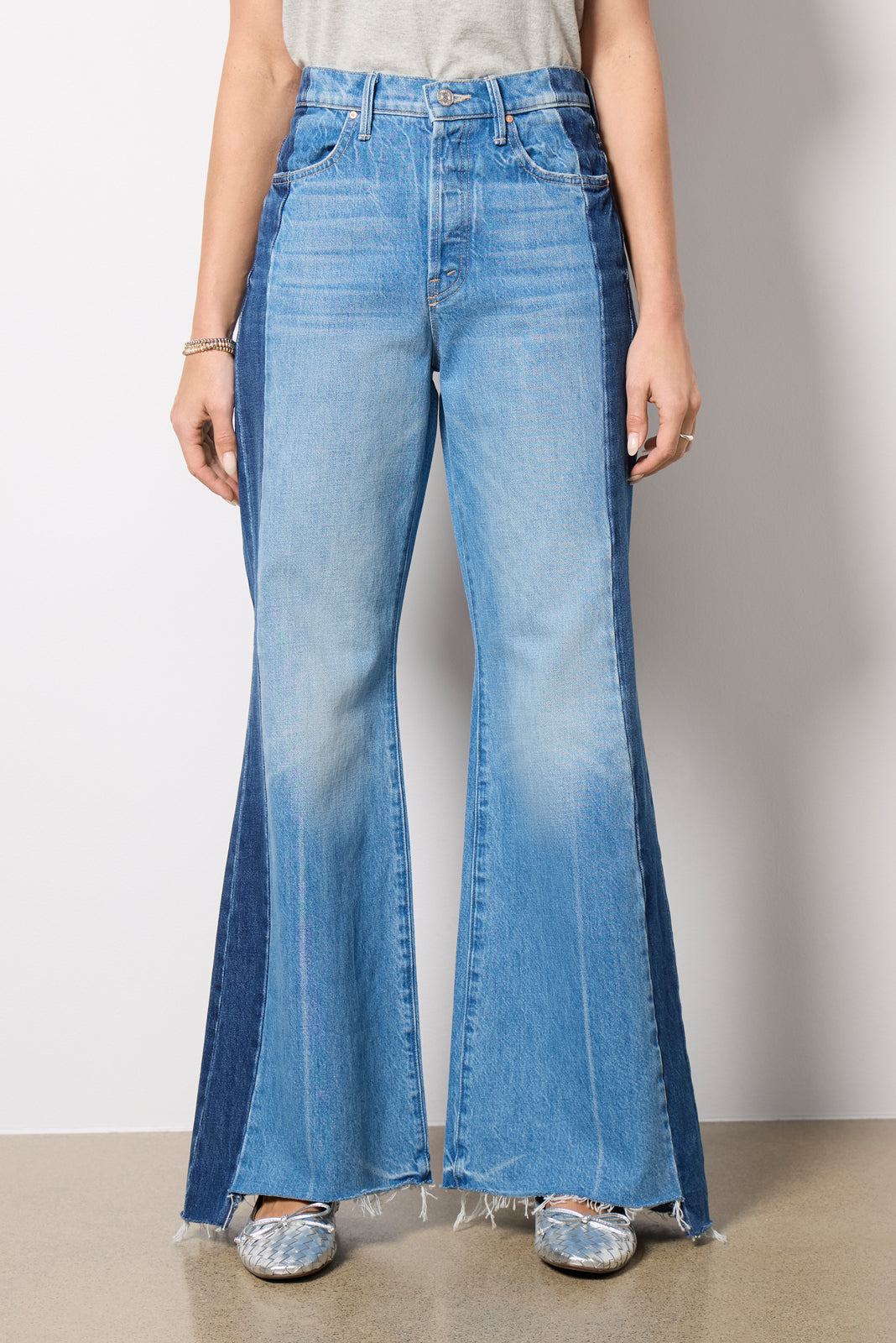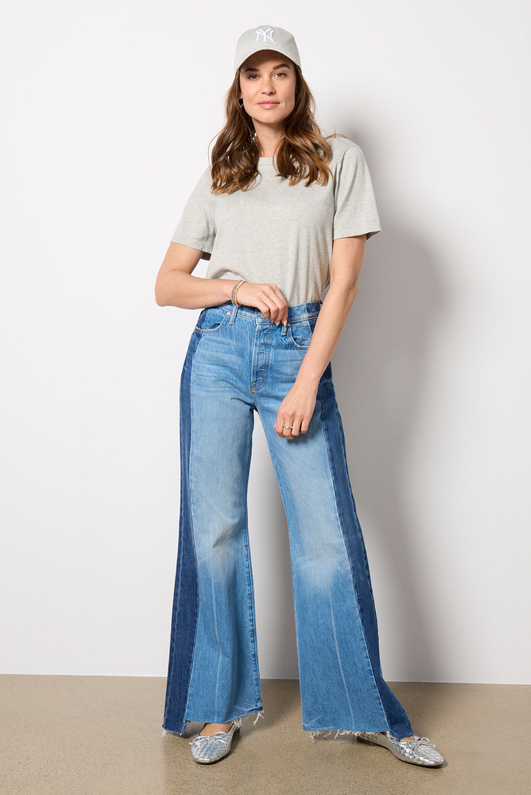Add bold style to your denim collection with The Tux Sidestepper Sneak Fray jean by MOTHER. Designed with darker panels down the sides. these wide leg jeans are crafted in rigid cotton denim with a high-rise waist. full-length leg. and frayed uneven hems.