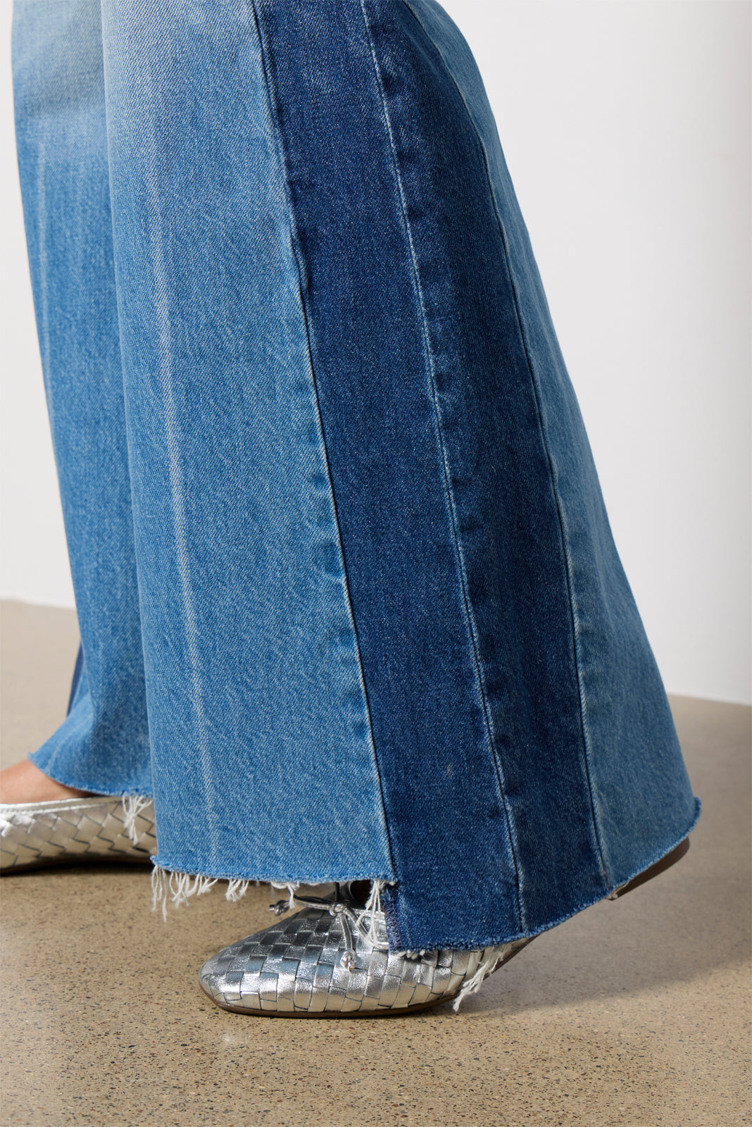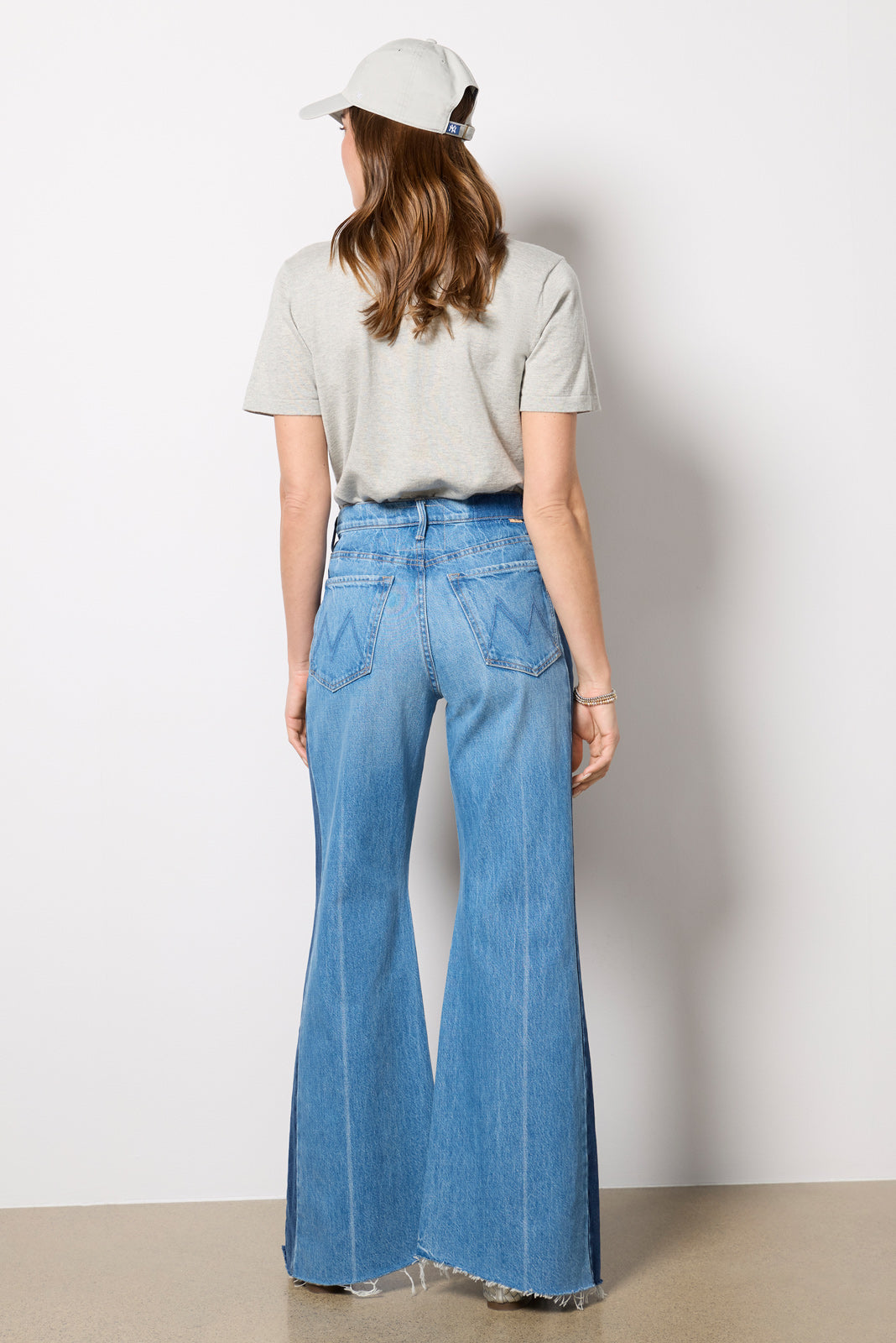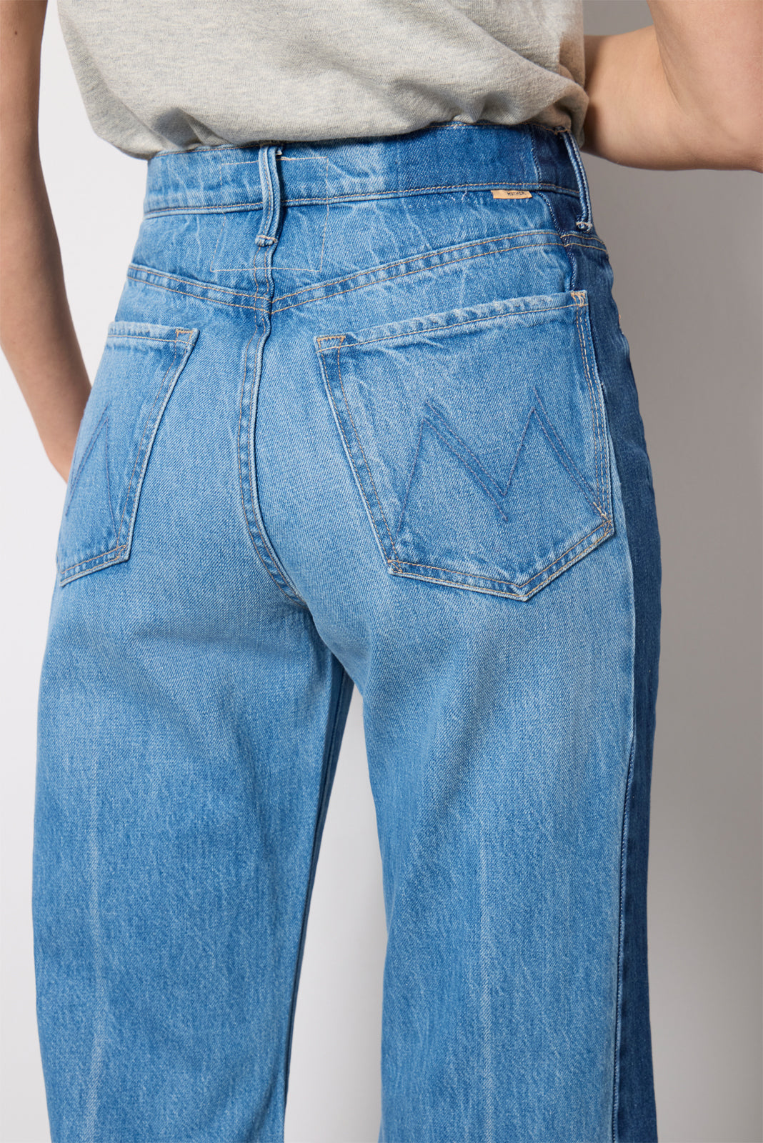 Add bold style to your denim collection with The Tux Sidestepper Sneak Fray jean by MOTHER. Designed with darker panels down the sides. these wide leg jeans are crafted in rigid cotton denim with a high-rise waist. full-length leg. and frayed uneven hems.