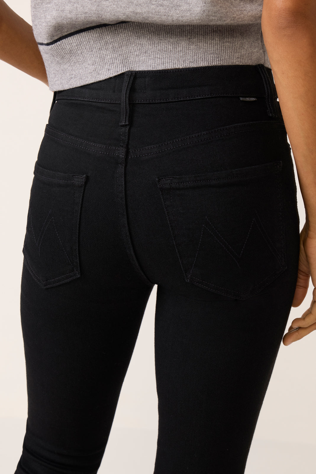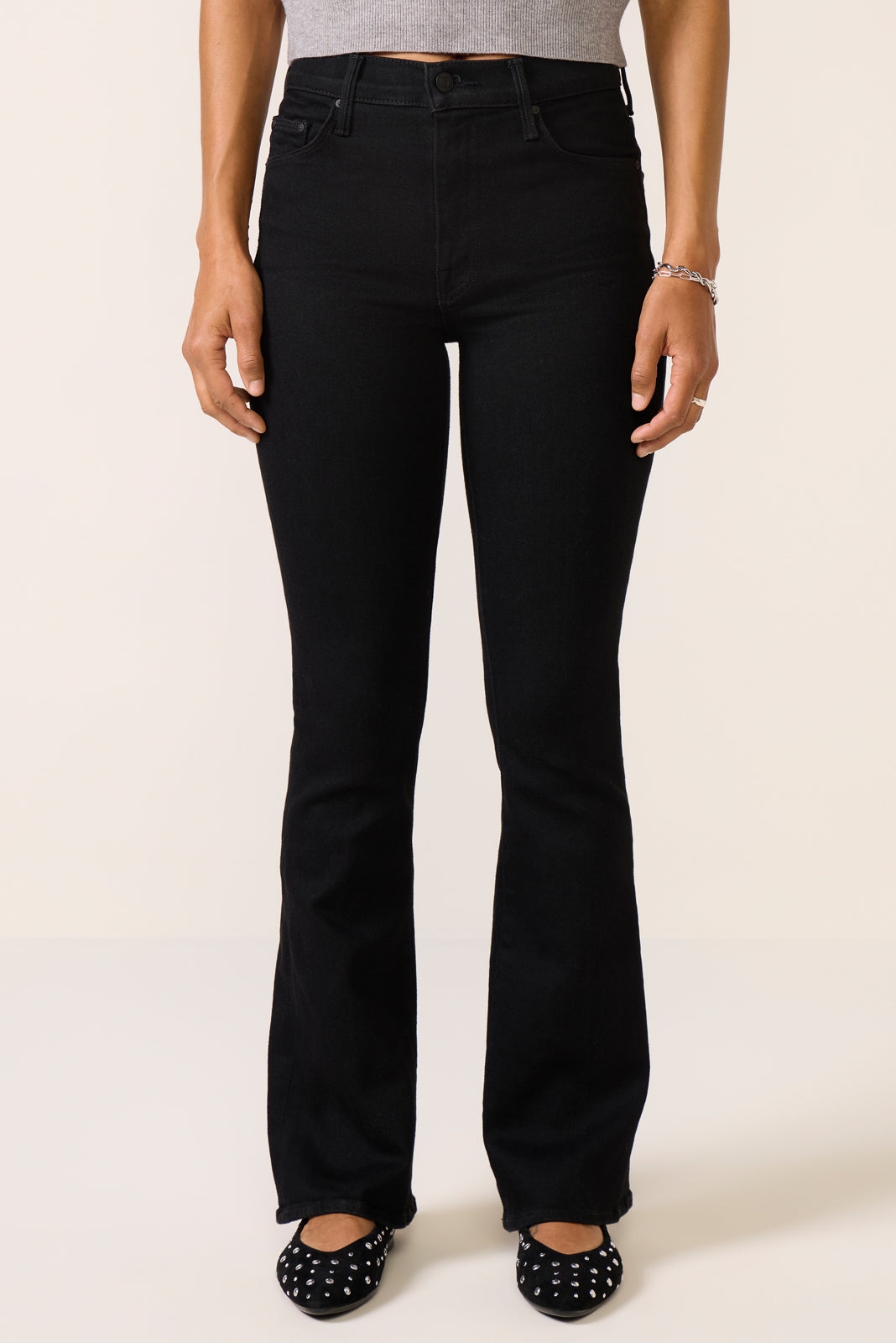 Finished with full-length?clean hems.?The Weekender flare jean by MOTHER is crafted?from soft stretch denim with a flattering mid-rise waist and?versatile black wash.