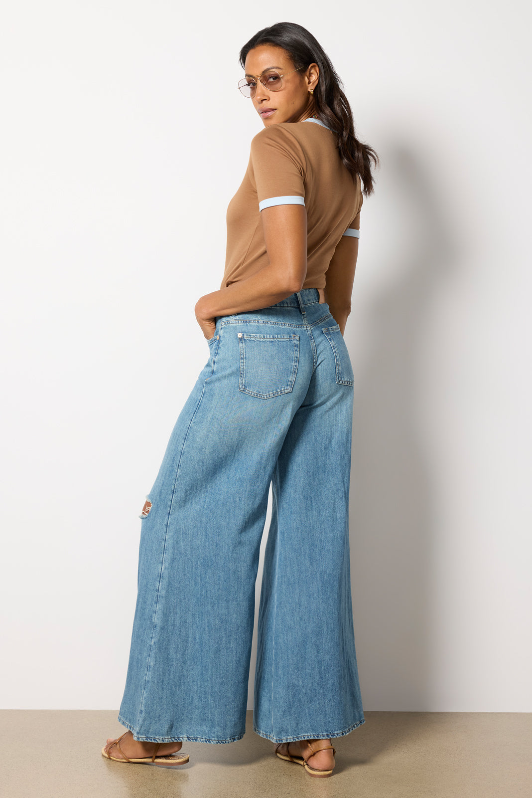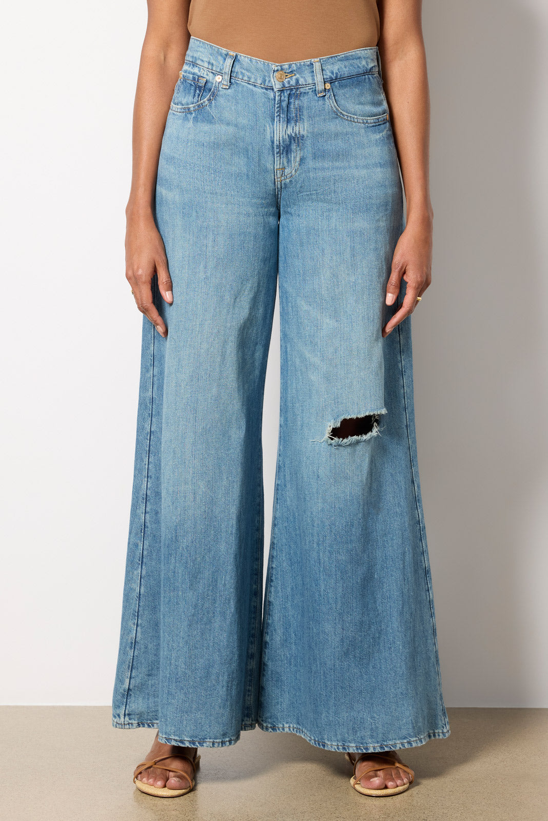 An exaggerated wide-leg silhouette defines the Willow?jean by 7 For All Mankind. Finished?in soft. super lightweight linen denim. these wide leg jeans feature?a mid-rise waist. full-length inseam. and destruction at the knee.